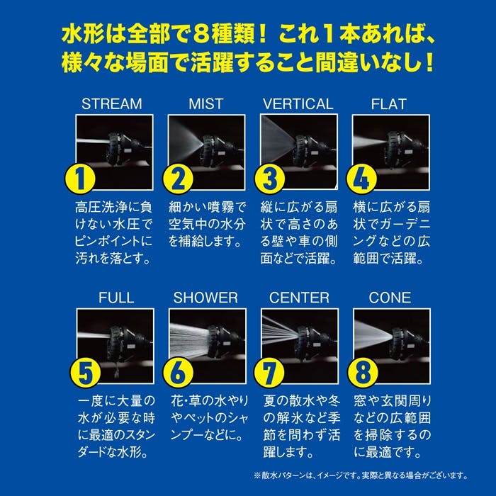 水形は全部で8種類!これ1本あれば、様々な場面で活躍すること間違いなし!耐水圧:0.41-0.55MPa(4.2-5.6kgf/cm2)耐熱温度:MAX40℃適合ホース:内径12~15mm、外径20mmまで