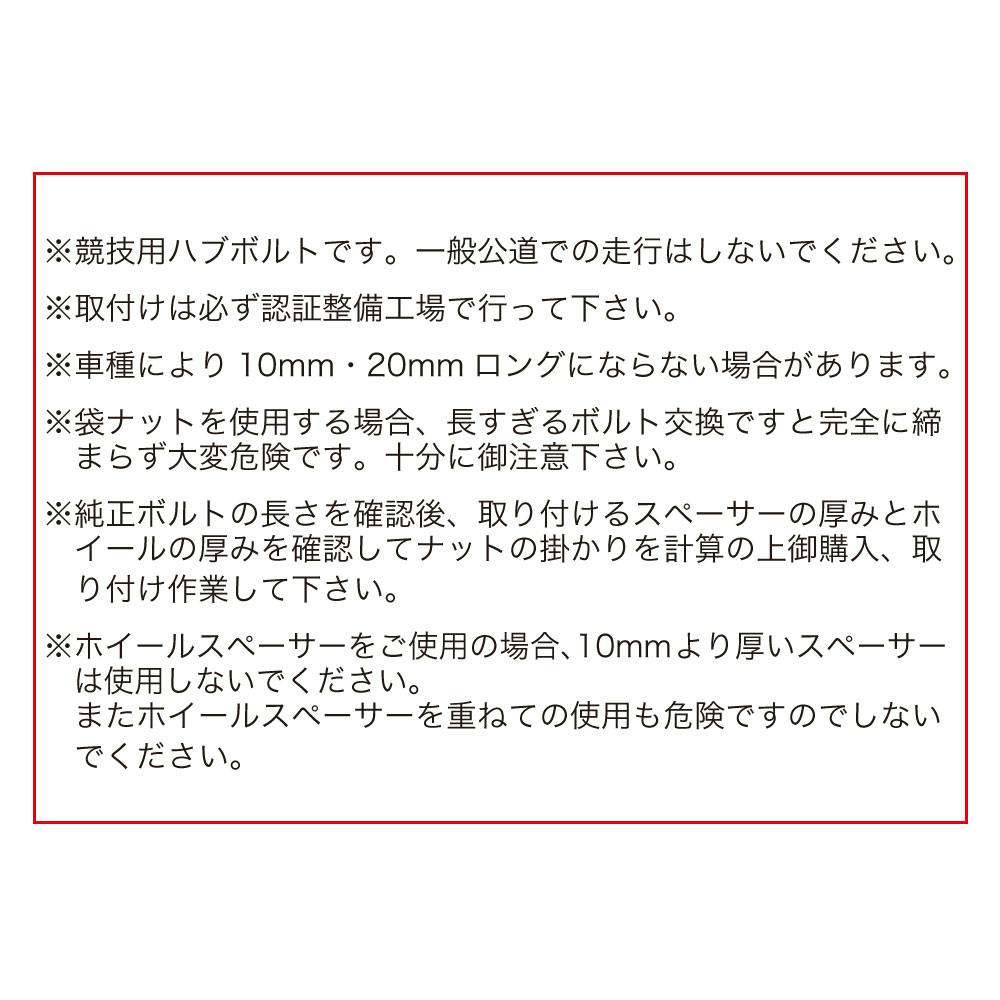 ※取付けは必ず認証整備工場で行って下さい。※車種により10mm・20mmロングにならない場合があります※純正ボルトの長さを確認後、取り付けるスペーサーの厚みとホイールの厚みを確認してナットの掛かりを計算の上御購入、取り付け作業して下さい。※ホイールスペーサーをご使用の場合、10mmより厚いスペーサーは使用しないでください。またホイールスペーサーを重ねての使用も危険ですのでしないでください。