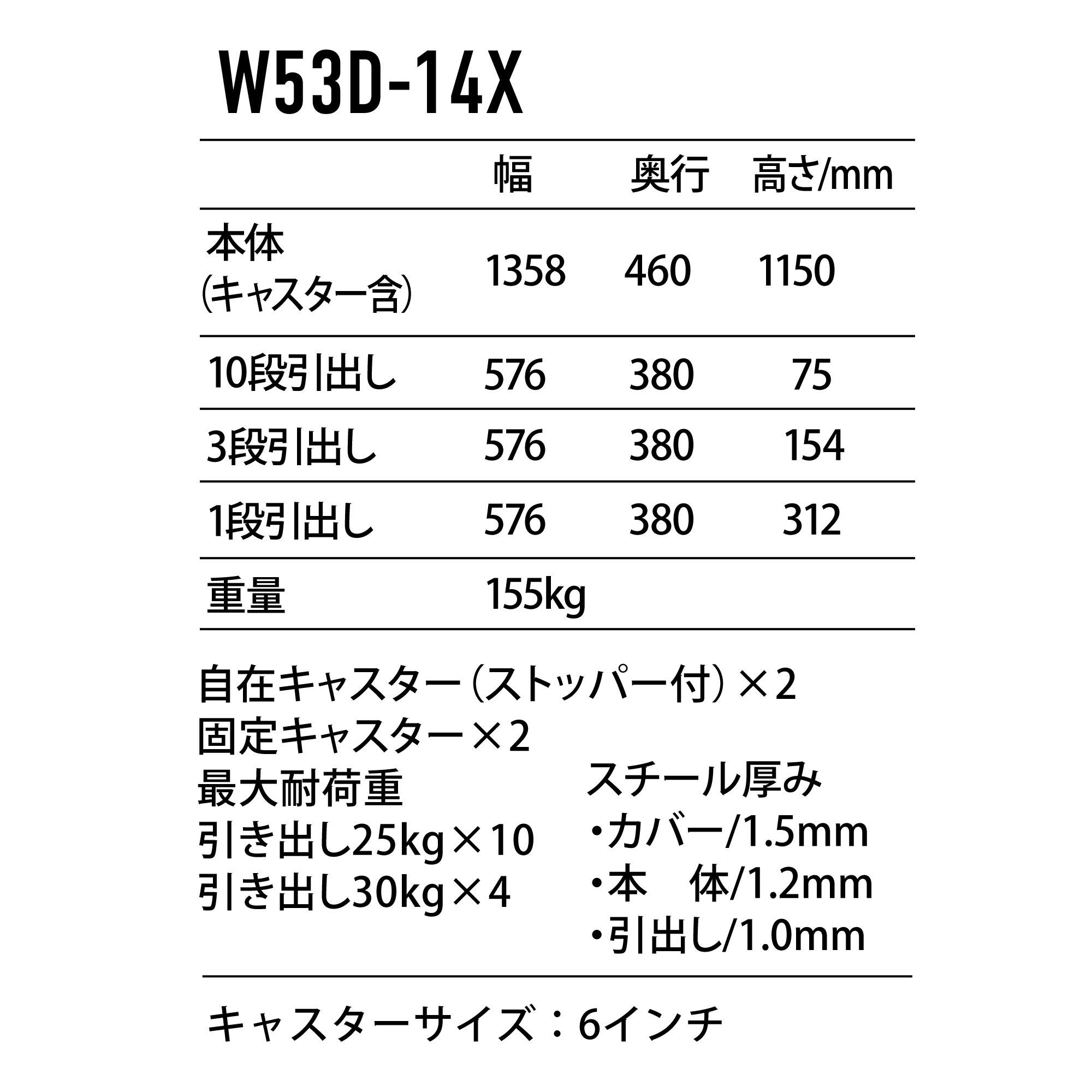 カラー:赤キャスターサイズ:6インチオーバーレール:幅1358×深さ460×高さ980mm10段引出し:幅576×深さ380×高さ75mm3段引出し:幅576×深さ380×高さ154mm1段引出し:幅576×深さ380×高さ312mm自在キャスター(ストッパー付)×2、固定キャスター×2【最大耐荷重】引き出し25kg×10引き出し30kg×4