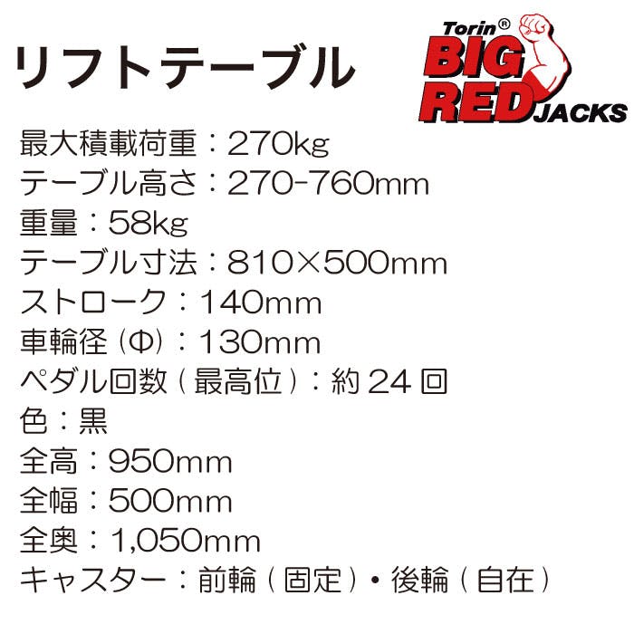 最大積載荷重:270kgテーブル高さ:270-760mmテーブル寸法:810×500mmストローク:140mm車輪径(φ):130mmペダル回数(最高位):約24回色:黒キャスター:前輪(固定)・後輪(自在)