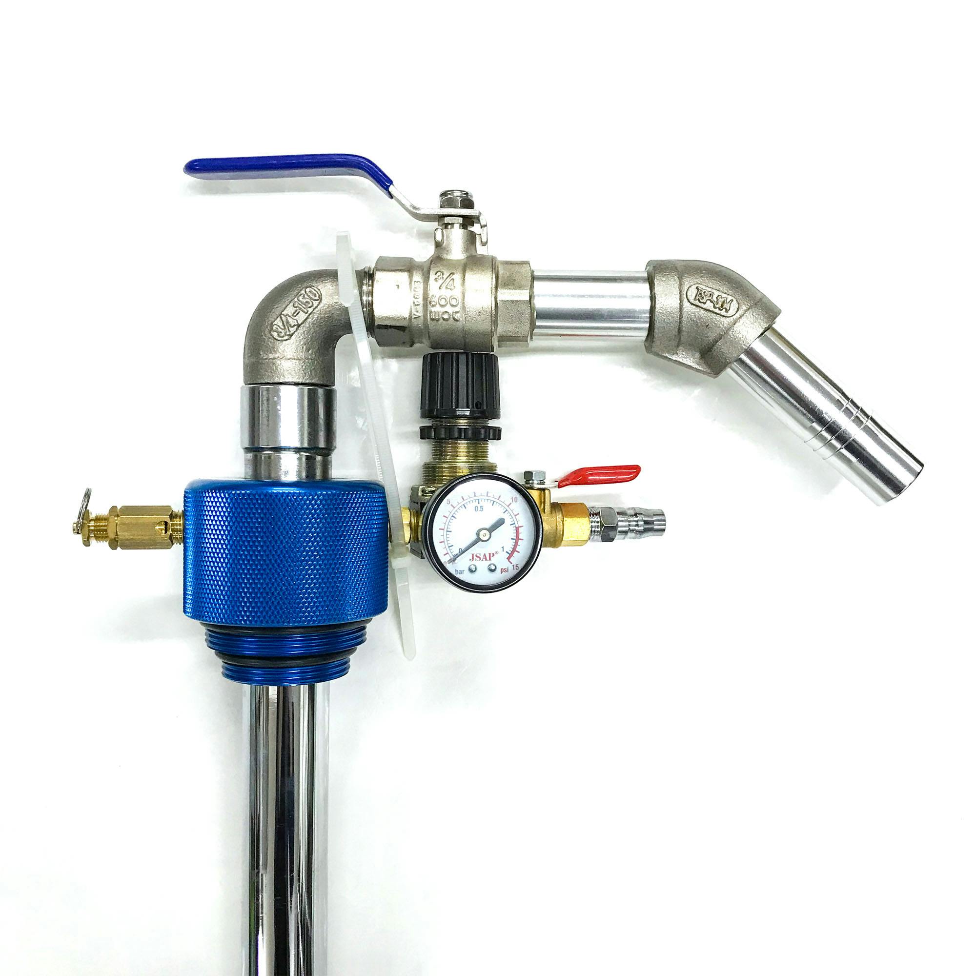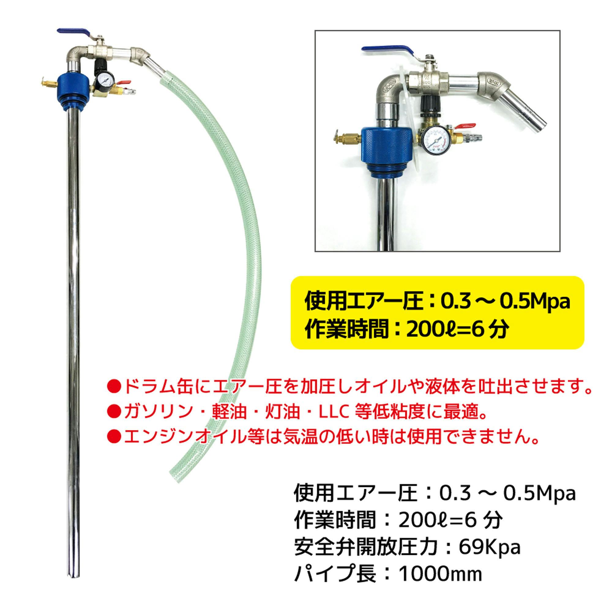 エアードラムポンプ(エアー加圧式)・ガソリン・軽油・灯油・LLC等低粘度に最適・エンジンオイル等は気温の低い時は使用できません。◆使用エアー圧:0.3~0.5MPa◆作業時間:200L=6分◆安全弁開放圧力:69Kpa◆パイプ長:1000mm