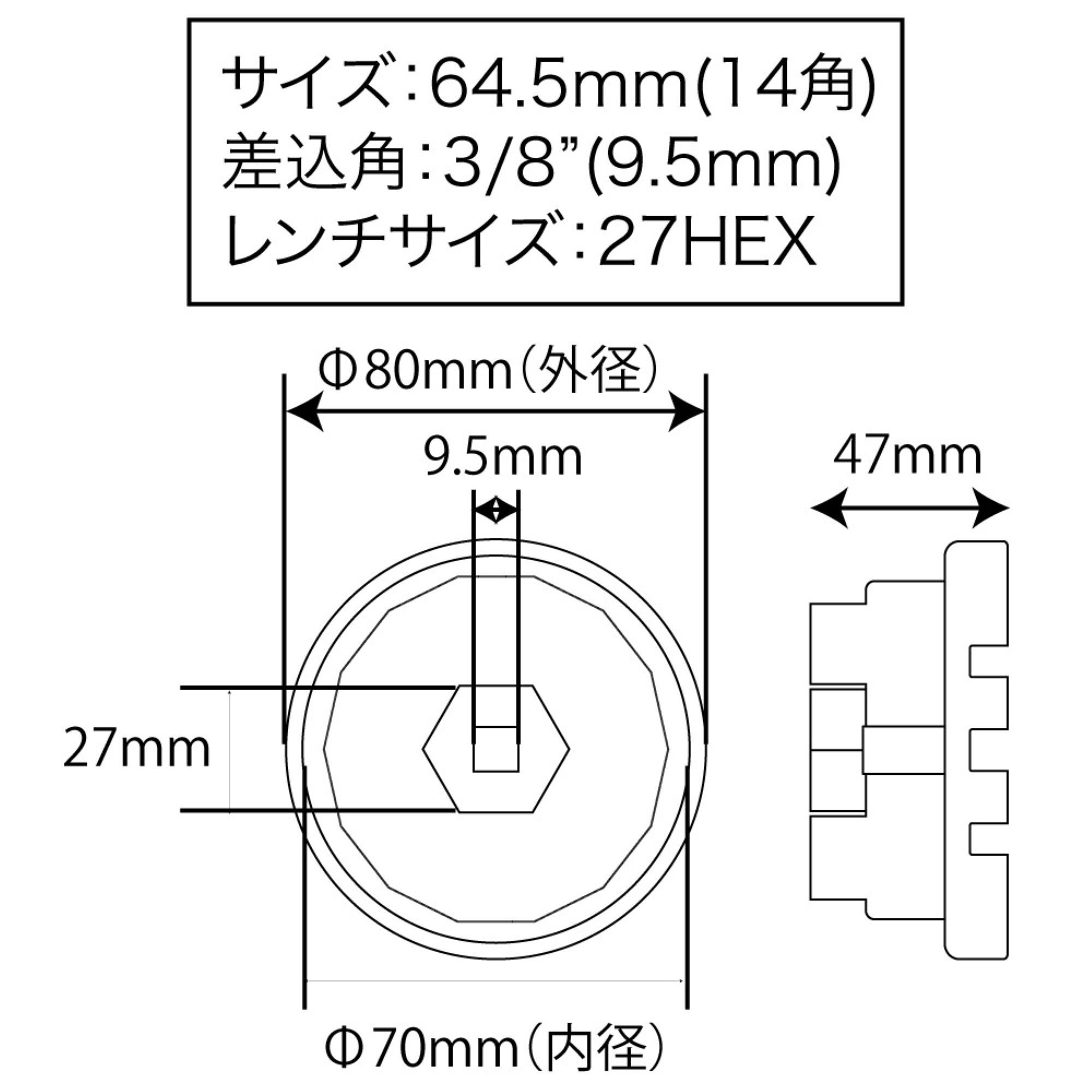 トヨタ用オイルフィルターレンチ(小)サイズ:64.5mm 差込角:3/8”(9.5mm)角 レンチサイズ:27HEX ※適応車種はエレメントのサイズを確認の上、ご判断下さい。