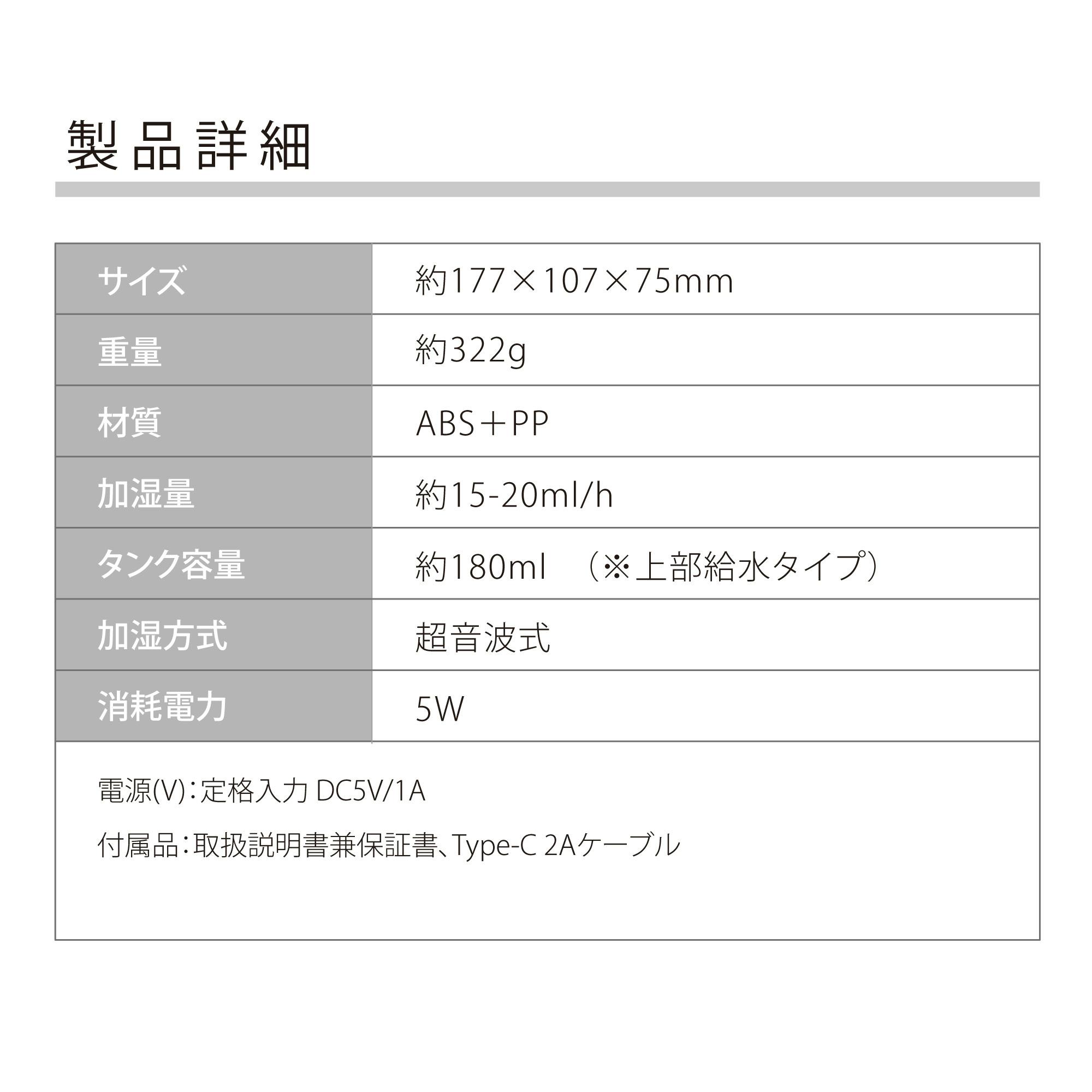 ●アロマ対応。●LEDライトとフォグデザイン。●2段階の明るさ調整。●上部吸水タイプ。加湿量:15-20ml/hタンク容量:180ml消費電力:5Wカラー:ホワイト
