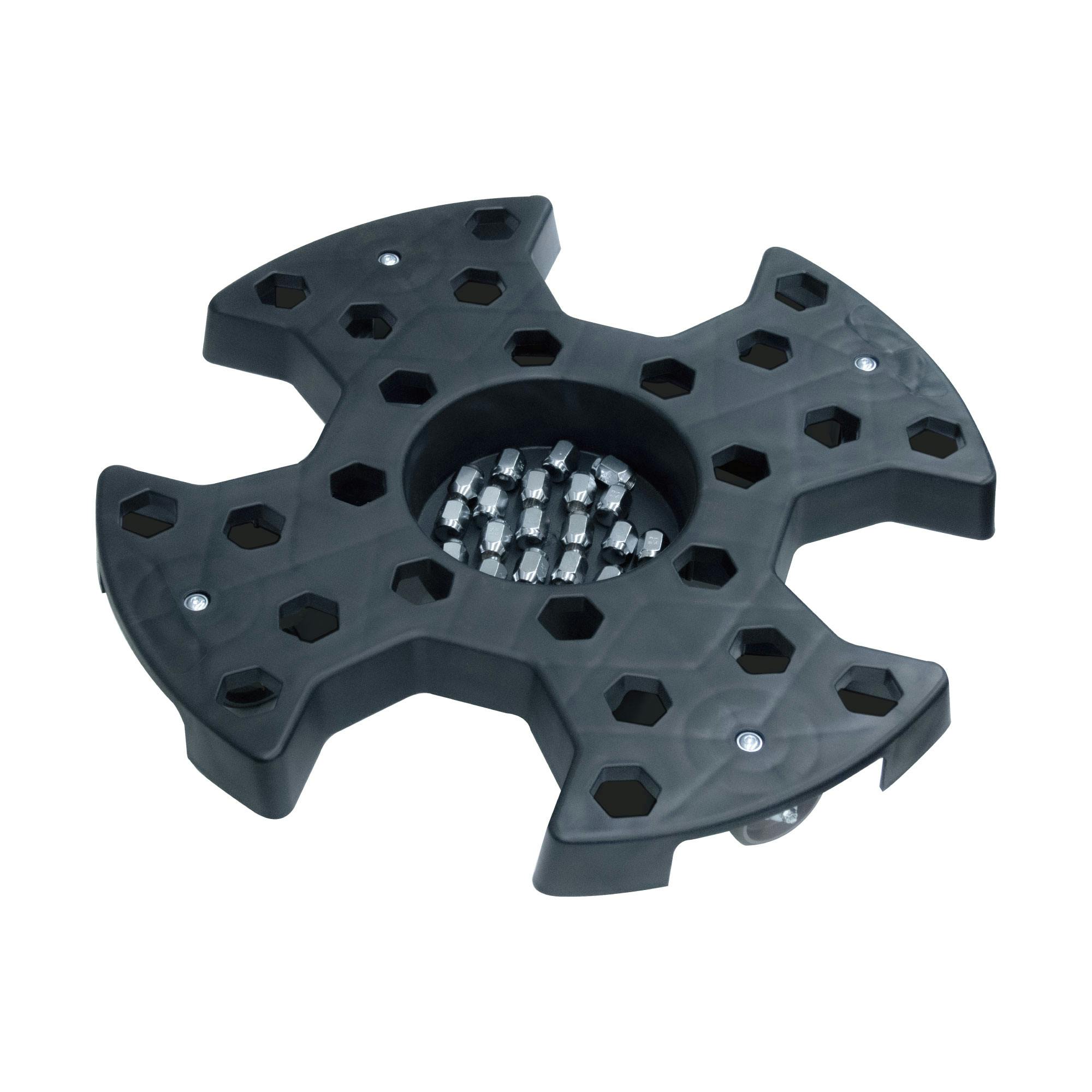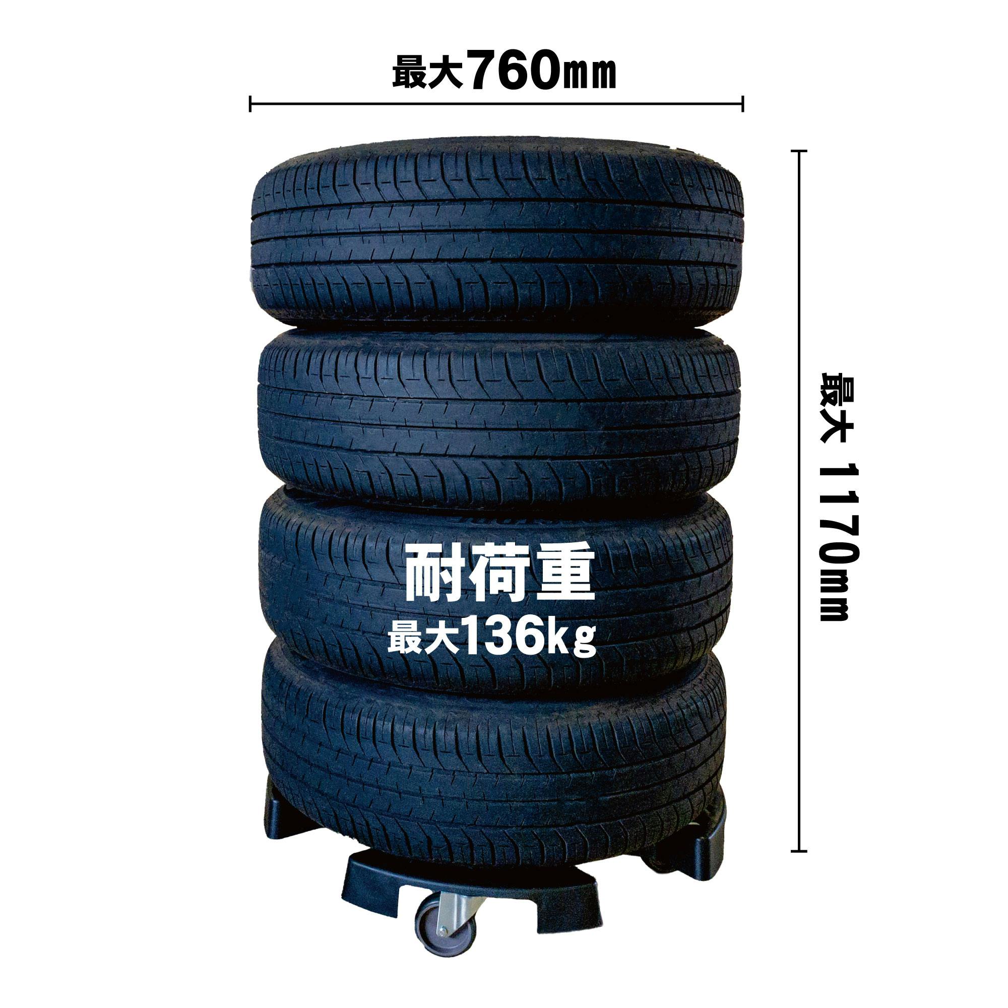 ■タイヤ交換や保管に便利!■作業後はタイヤを載せたまま保管ができます。■ストッパー付キャスター(1箇所)で保管時も安全■タイヤを平積みしてコンパクトに収納できます。■中心部はナット保管用のトレイになっています。■タイヤの展示用としてもご利用出来ます。耐荷重:136kg本体質量:約3.4kg積載仕様:タイヤ4本まで材質:PPサイズ:640(W)×640(D)×110(H)mm