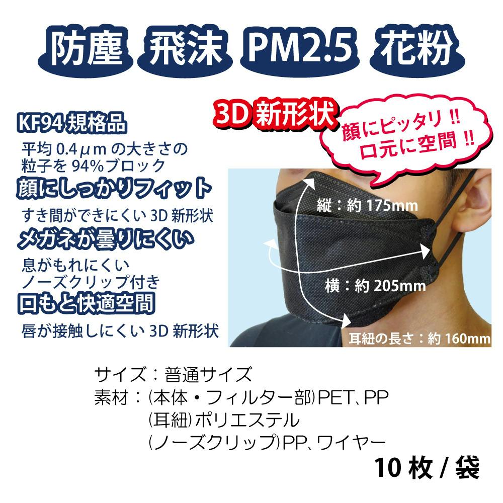 ◆KF94規格品 平均0.4μmの大きさの粒子を94%ブロック◆顔にしっかりフィット 隙間ができにくい3D新形状◆メガネが曇りにくい 息がもれにくい、ノーズクリップ付き◆口もと快適空間 唇が接触しにくい3D新形状枚数:10枚/袋