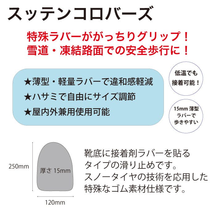 ★薄型・軽量ラバーで違和感軽減★ハサミで自由にサイズ調節★屋内外兼用使用可能低温でも装着可能! 15mm薄型ラバーで歩きやすい靴底に接着剤ラバーを貼るタイプの滑り止めです。スノータイヤの技術を応用した特殊なゴム素材仕様です。