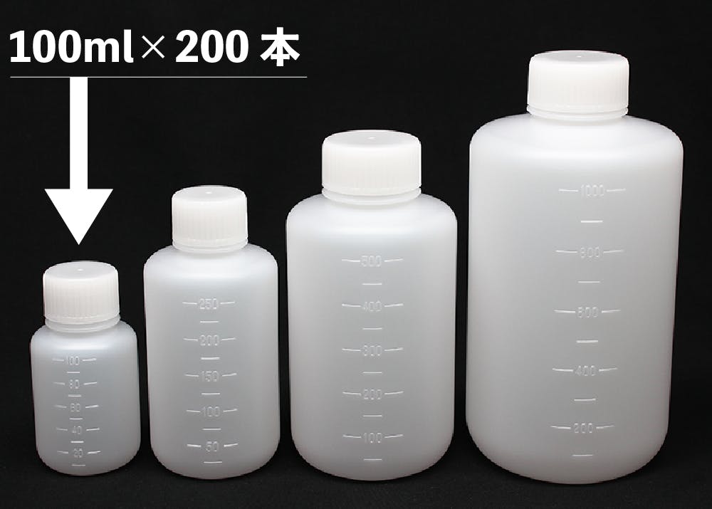 ●材質:・本体:高密度ポリエチレン(HDPE)・キャップ:ポリプロピレン(PP)●容量(ml):100●目盛(ml):10●口内径(mm):(A)21.5●本体外径(mm):(B)50●蓋なし高さ(mm):(C)91.5●蓋付き高さ(mm):(D)94●入数(本):200