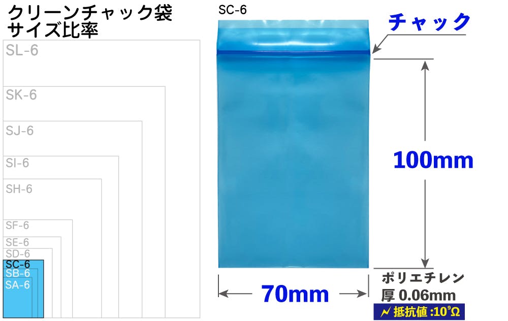クリーンチャック袋 SC-6 70×100 200枚入 ポリエチレン ライトブルー クリーン 101-54803【別送品】
