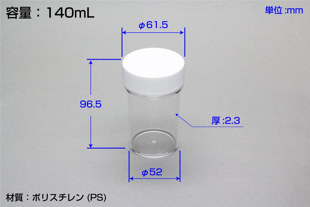 ●容量(ml):140●品名:SN-140●入数:1本(ケース単位のご購入は:288本)●上径×下径×高さ(mm):61.5φ×52.0φ×96.5H●色:透明●耐熱温度(℃):80●本体:ポリスチレン(PS)●キャップ:ポリエチレン(PE)●中栓:なし