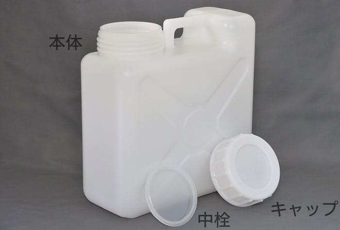●本体材質:高密度ポリエチレン(HDPE)●キャップ材質:高密度ポリエチレン(HDPE)●中栓材質:低密度ポリエチレン(LDPE)●容量(L):10●口内径(mm):98●サイズ(mm):145×320×332H