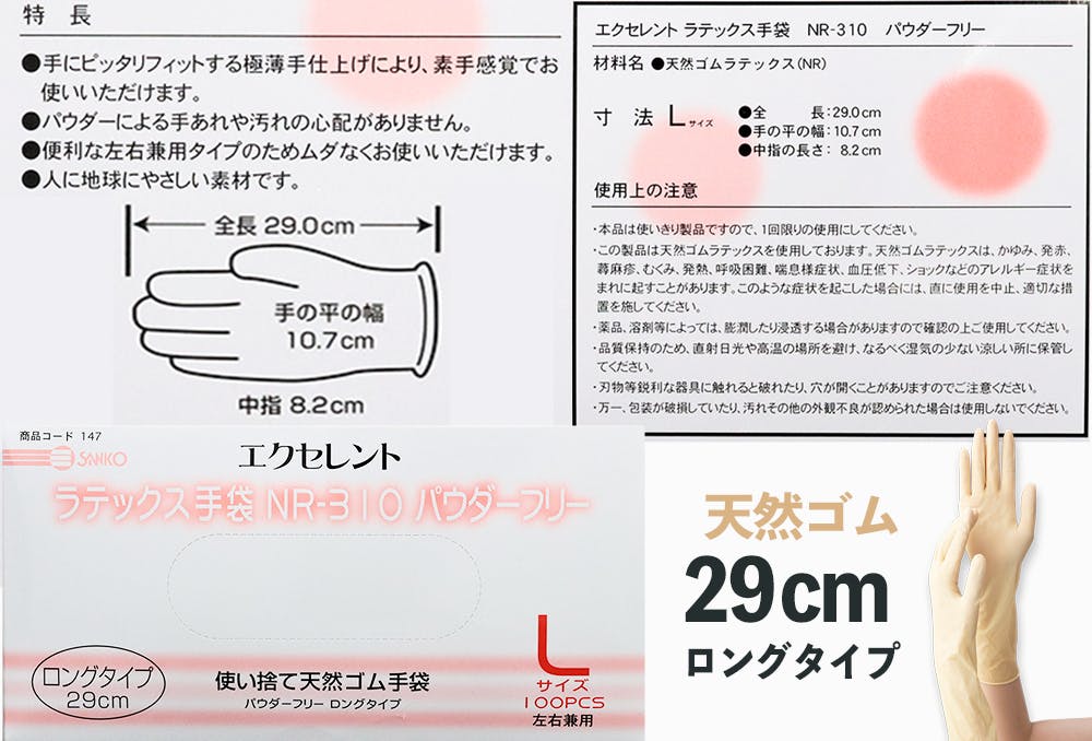 ●サイズ゛:L●全長(mm):290●手の平の幅(mm):107●中指の長さ(mm):82●入数(枚):100●材質:天然ゴム(ラテックス)●タイプ:左右兼用、ロングタイプ、パウダーフリー