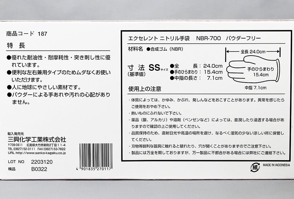 ●品番:NBR-700●材質:ニトリルゴム●手袋カラー:ライトパープル●箱カラー:ピンク●サイズ:SS●全長(mm):240●掌幅(mm):77●中指長(mm):71●入数:100枚