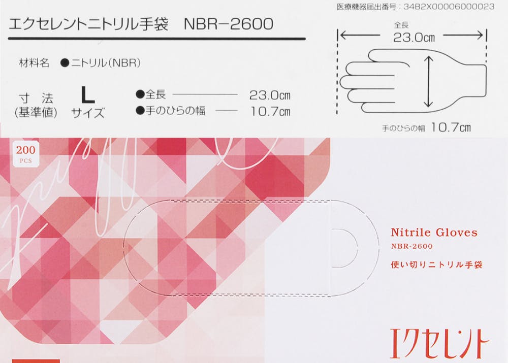 ●品番:272630●サイズ:L●全長(mm):230●掌幅(mm):98●指先の厚さ(基準値mm):0.09●内箱の色:レッド●入数:200枚一般医療機器非天然ゴム製検査・検診用手袋 JMDNコード:70976000販売名:エクセレントニトリル手袋 NBR-2600医療機器届出番号:34B2X00006000023