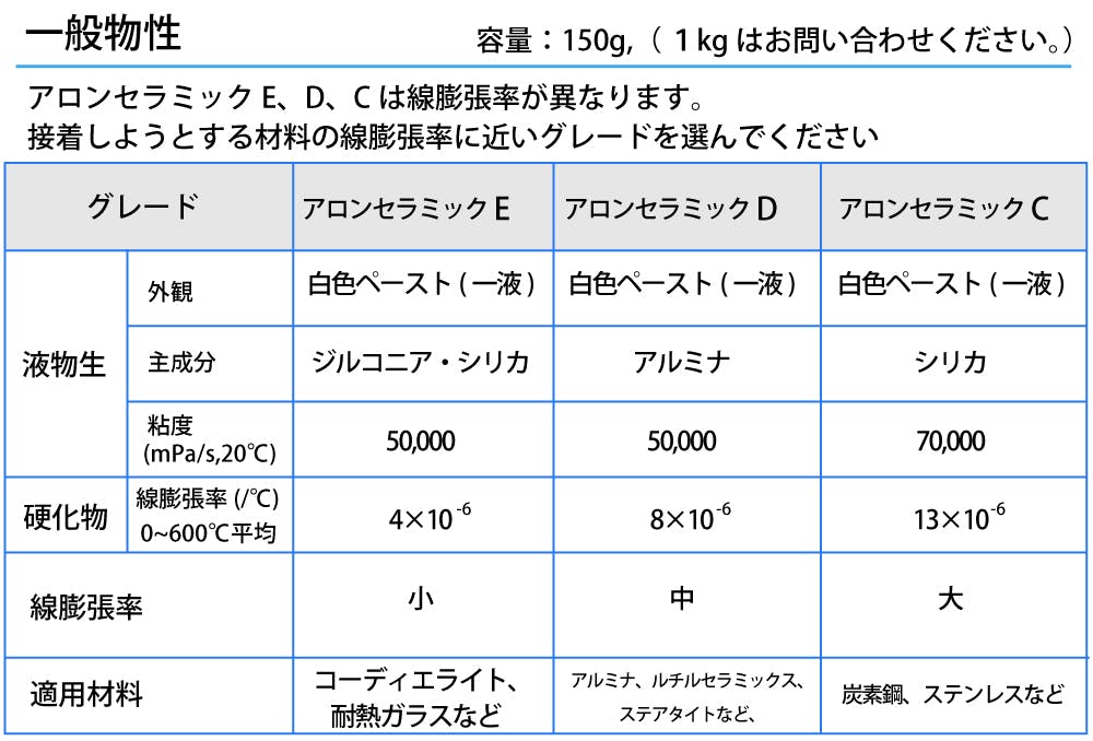 ●品番:C●容量(g):150●接着強さ(kgfcm^2):200●線膨張率(℃):13×10-6
