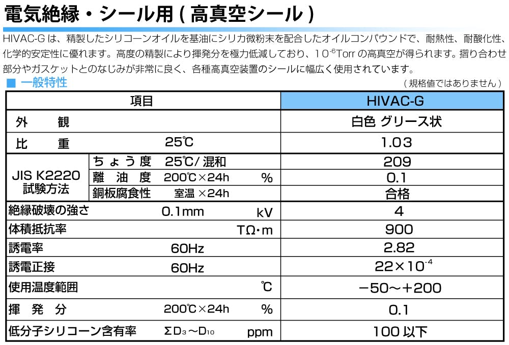 ●品番:HIVAC-G●容量:100gチューブ入●摘要:-50℃~+200℃の広い温度範囲で固化、流動、蒸発せず、10^-6 torr程度の高真空を保持することができます。化学的に安定で人畜には全く無害です。