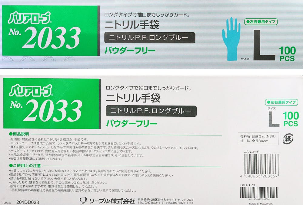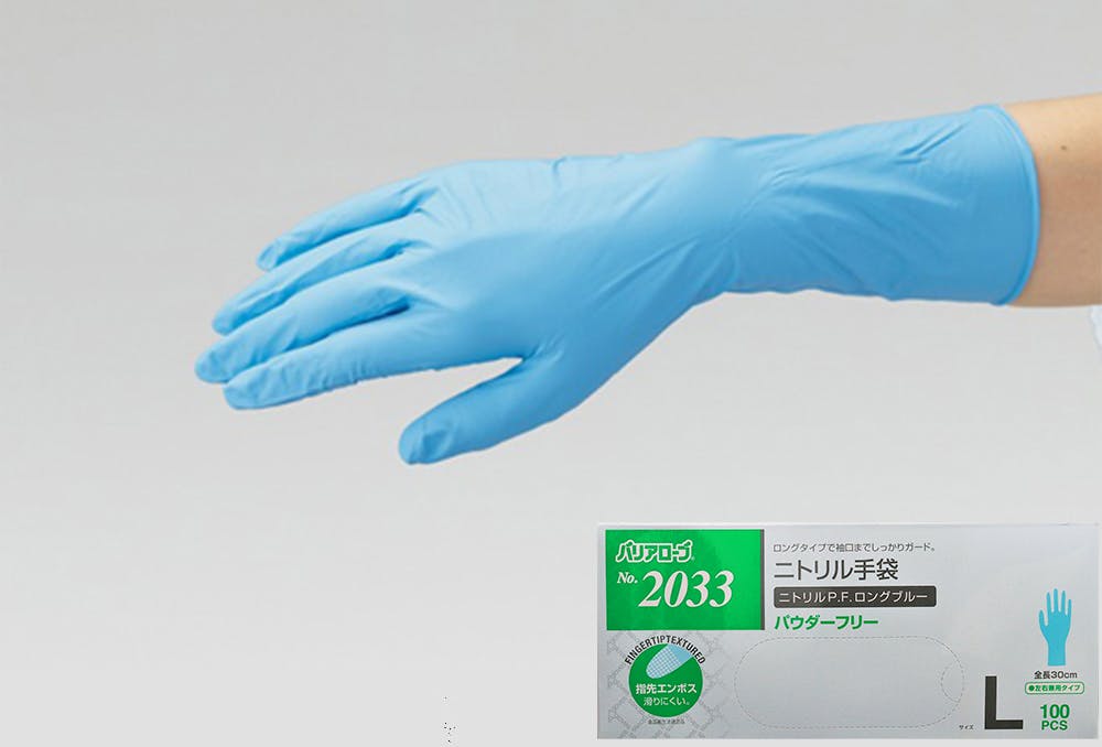 No.2033 ニトリルP.F.ロング ブルー Lサイズ 100枚入 食品衛生法 異物混入防止 ラテックスアレルギー 304-0000211【別送品】