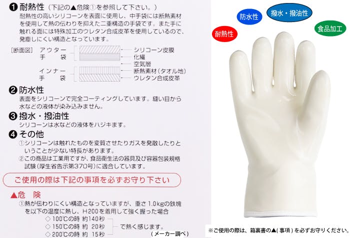 ●品名:ダイローブH200●サイズ:LL●色:白/半透明●表面:シリコーン●裏地:ポリエステル,インナー:断熱布●全長(mm):280●厚さ(mm):2.95●掌幅(mm):130●中指長(mm):79●入数(双):1