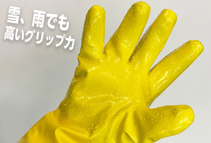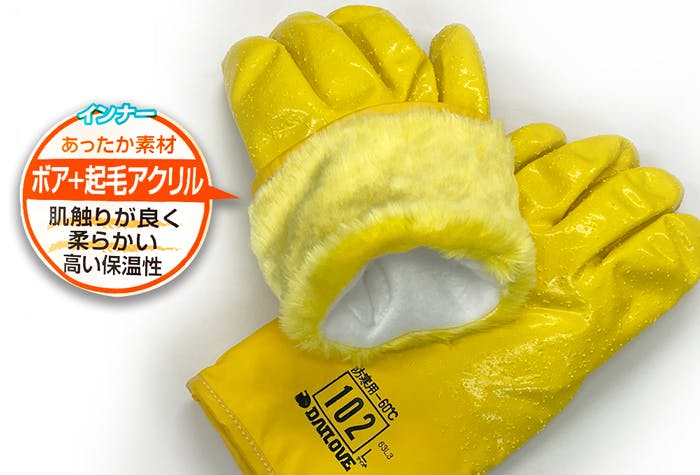 ●品名:ダイローブ102●サイズ:L●カラー:黄●全長(mm):270●厚さ(mm):3.0●掌幅(mm):119●中指長(mm):82●表面材:ポリウレタン●裏地材:綿100%●インナー:ボア+起毛アクリル●入数:1双