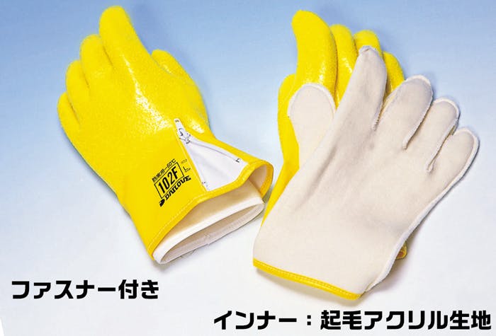 ●品名:ダイローブ102F●サイズ:L●色:黄●全長(mm):270●厚さ(mm):3.0●掌幅(mm):135●中指長(mm):82●表面材:ポリウレタン●裏地材:綿100%●インナー:起毛アクリル●入数:1双