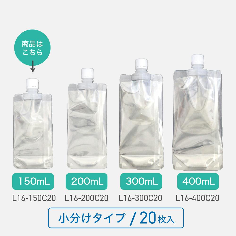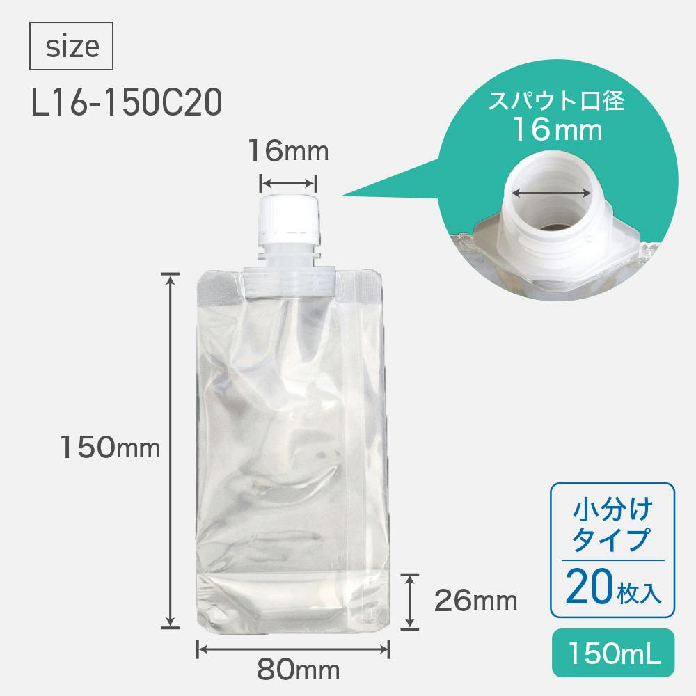 ●品番:L16-150C20●容量目安(mL):150●スパウト口径(mm):16●サイズ(mm):80×150●内底ガゼット寸法(mm):26●色:透明無地●基本構成:透明蒸着PET#12//PBT#15//LLDPE#100(厚さ127μ)