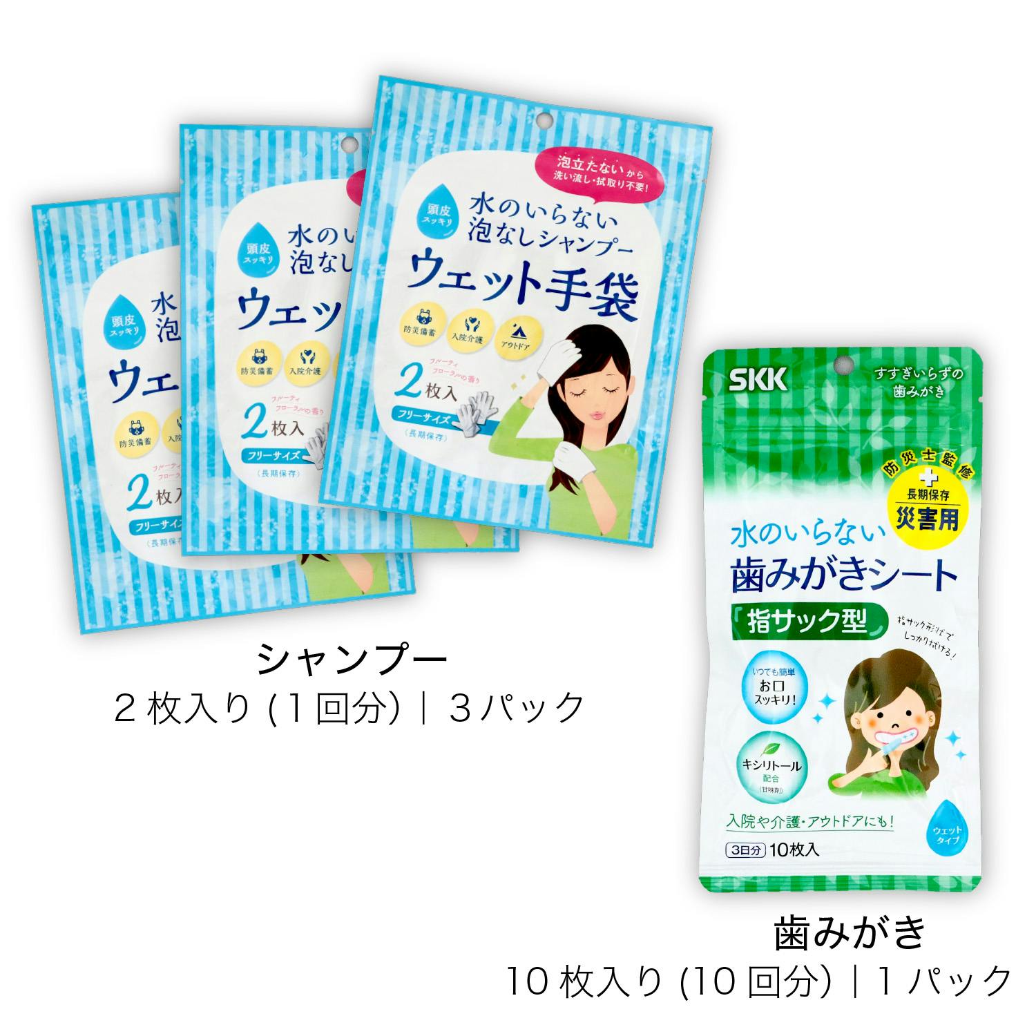 ●5年保存可能●セット内容 (1人用 約3日分)<シャンプー> SKKウェット手袋・手袋型だから子ども~お年寄りまで使いやすい・災害時のストレスケアに効果的・ノンアルコール/フルーティーフローラルの香り/保湿成分配合<歯磨き> SKK歯磨きシート「指サック型」・すすぎいらずでお口サッパリ・虫歯や誤嚥性肺炎対策に効果的・ノンアルコール/無香料/キシリトール配合