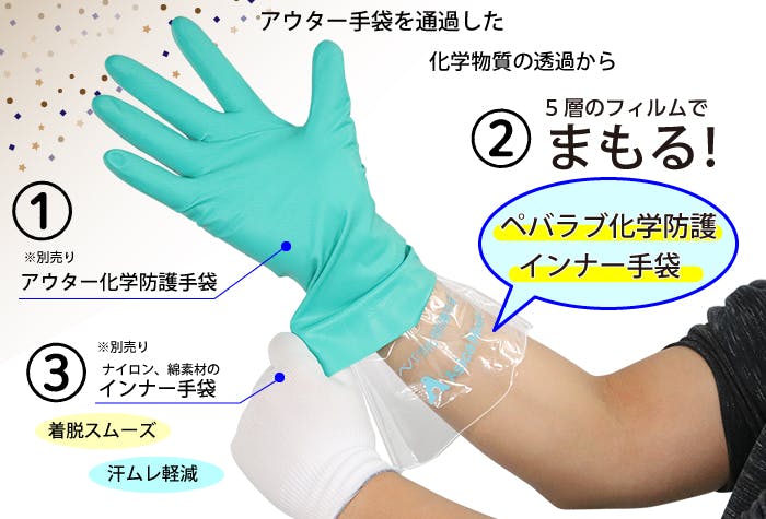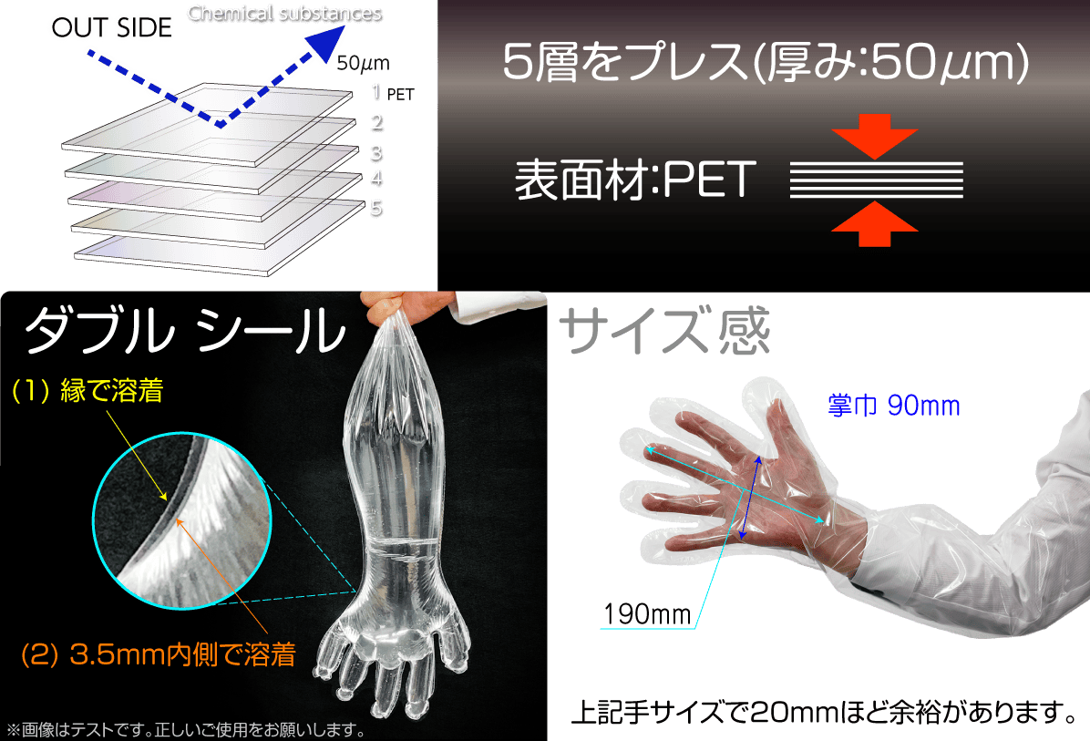 ●品番:A10004●材質:5層ラミネート構造フィルム(表面素材PET)●サイズ:フリーサイズ(左右兼用)(掌部の幅103mm×長さ390mm×厚さ50マイクロメートル)●接合部:熱溶着・ダブルシール構造●入数(枚):50JANコード:4517850001805