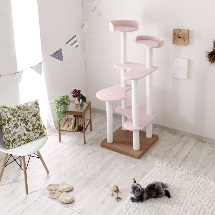日本製のキャットタワー。ポールを繋ぎ合わせているキャップは木製を使用し丈夫で安全です。日本製の接着剤F☆☆☆☆を使用し、猫が嫌がる匂いはほとんどありません。ポール部分も職人が手作業で巻いていますので。丈夫で長持ち。ビニロンは綿のような風合いですが毛羽立ちしにくく丈夫です。組立も女性一人で軽くて簡単。猫ちゃんの後ろ姿を2段目のステップに再現。愛らしいキャットタワー。