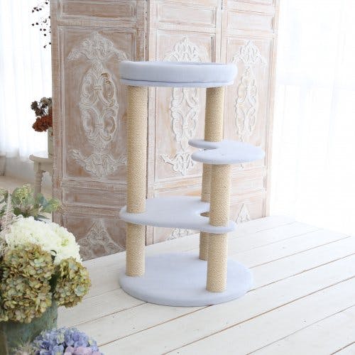 日本製のキャットタワー。ポールを繋ぎ合わせているキャップは木製を使用し丈夫で安全。日本製の接着剤F☆☆☆☆を使用し、猫が嫌がる匂いは殆どありません。ポール部分も職人が手作業で巻いていて丈夫で長持ち。ビニロンは綿のような風合いですが毛羽立ちしにくく丈夫。組立も女性一人で軽くて簡単。小さな猫や高齢の足腰が弱った猫にも安心して使えるミニキャットタワー。上段でリラックスする愛猫を見て癒されてください。