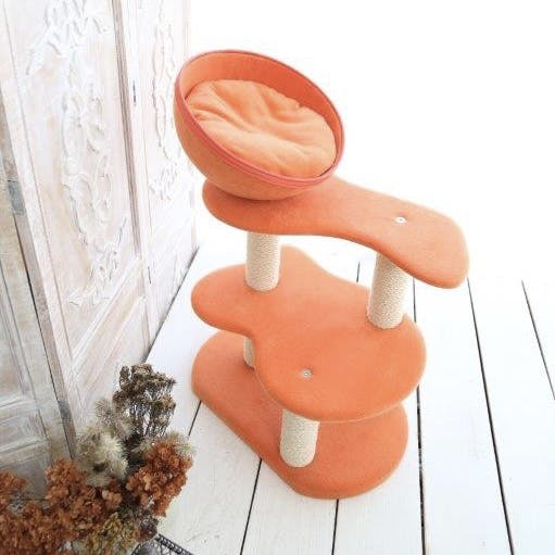 日本製のキャットタワー。ポールを繋ぎ合わせているキャップは木製を使用し丈夫で安全です。日本製の接着剤F☆☆☆☆を使用し、猫が嫌がる匂いは殆どありません。ポール部分も職人が手作業で巻いているので丈夫で長持ち。麻縄は自然な風合いでインテリアになじみます。組立も女性一人で軽くて簡単。小さな猫や高齢の足腰が弱ってきたシニア猫にも安心。ラウンドベッド部分は猫ちゃんがリラックスできる自分だけの場所になります。