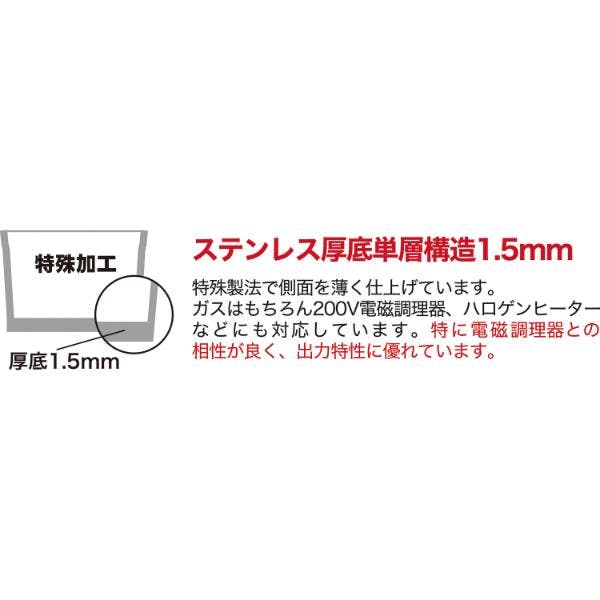 特殊製法で側面を薄く仕上げています。対応熱源:電磁調理器 (IH 100V・200V)、ガス、ラジェントヒーター、シーズヒーター、ハロゲンヒーター、プレートヒーター、オール熱源対応 (電子レンジ・オーブンを除く)