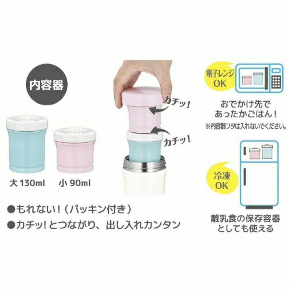 [使い方]1.離乳食を内容器に入れる。2.内容器を冷蔵庫で冷やす。冷凍もOK!3.冷やした内容器を保冷ポーチに入れる。※保温はできません。4.お食事タイム!電子レンジOK。お出かけ先でもあたためられる。* 容量:220ml(容器大:130/容器小:90)* 本体寸法:約W8×D8×H16cm* 本体重量:約0.3kg
