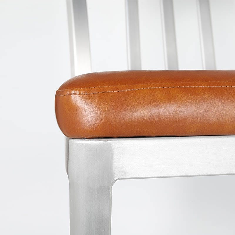 優れた機能性と、美しいフォルムで知られるネイビーチェアーを彷彿とさせるチェアー。無機質なアルミ素材に深みのあるブラウンのクッションを合わせました。タフな環境下でも長持ちする耐久性・防錆性を備えながらも軽量で、長時間座っても疲れにくい安定感が特徴。自宅のダイニングやカフェでもその魅力を存分に味わうことができるでしょう。