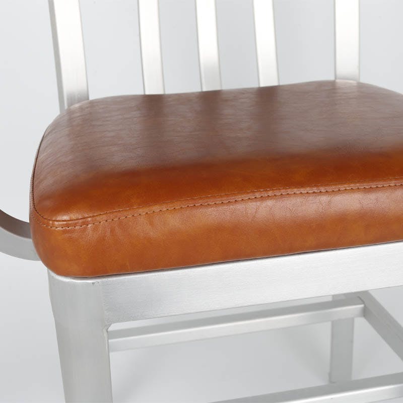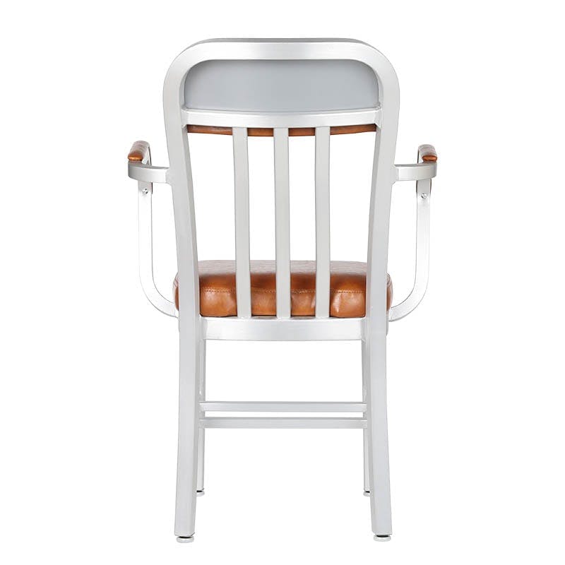 優れた機能性と、美しいフォルムで知られるネイビーチェアーを彷彿とさせるチェアー。無機質なアルミ素材に深みのあるブラウンのクッションを合わせました。タフな環境下でも長持ちする耐久性・防錆性を備えながらも軽量で、長時間座っても疲れにくい安定感が特徴。自宅のダイニングやカフェでもその魅力を存分に味わうことができるでしょう。