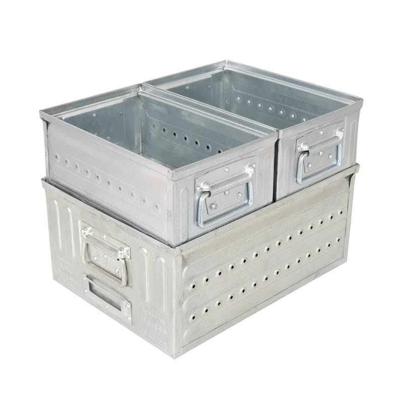 タフでハードなルックスそのままの性格。スタッキングしても、物を入れても響く金属音は決して小さくは無いけれど、それ位不器用な奴と過ごすのも面白い。ちょっと乱暴に使ってこそ分かり合える相棒かもしれません。サイズ違いとスタッキングが可能です。