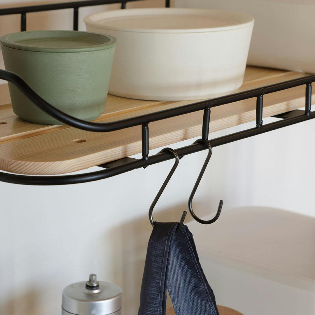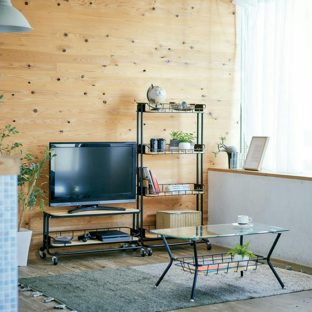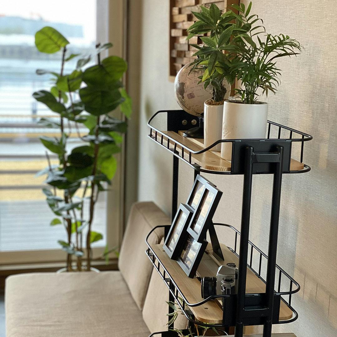 インテリア性のある個性的な棚はカゴ状で、置いた荷物が落ちにくい形状。棚前面のフレームは、物が出し入れしやすいように低く設計しています。カゴ内部の奥行きは265mm。A4サイズのファイルも収納できるサイズです。市販の収納ボックスとの組み合わせでさらに便利にお使いいただけます。インテリアグリーンとの相性も良く、プランツラックとしてもおすすめです。