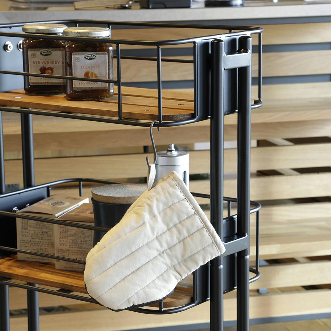 『BY CAGE WAGON』は、使うシーンを選ばない万能ワゴンです。棚は3段あり、一番下の棚は上部の空間が広く取ってあるので、高さのあるものも収納できます。棚のサイズ(内寸)は、約265×385mm。棚はカゴ状で置いた荷物が落ちにくい形状です。洗面所やキッチン、デスクサイドや、ソファサイド、ベッドサイド、キッズルームなど、様々な場所でご活用いただけます。脚にはキャスター付き。
