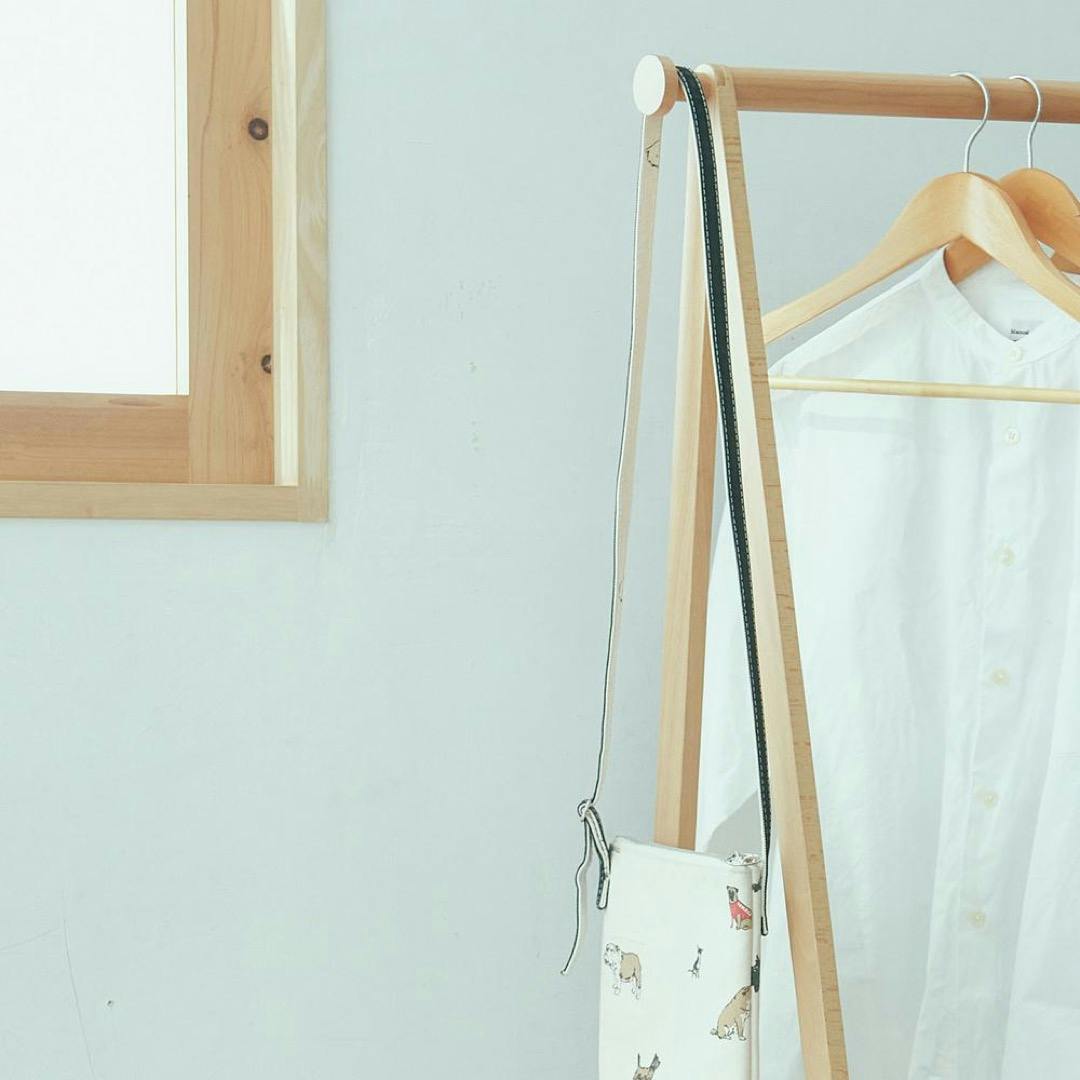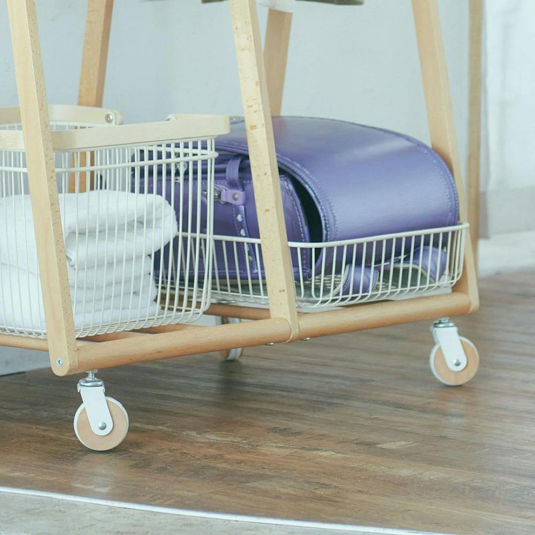深さのあるバスケットタイプの棚は、目が細かく置いた物が落ちにくい形状。木製フレームとバスケット棚の軽やかなコンビネーションも魅力です。高さは約1195mm。子供も手が届きやすいサイズで、親子で一緒に使えます。置き場に困るカバンやランドセル収納にも最適。両サイドのフックには小物がかけられます。天然木を使用したデザイン性の高いキャスター付きで、移動も簡単。ハンガーラックの下もお掃除がしやすい仕様です。
