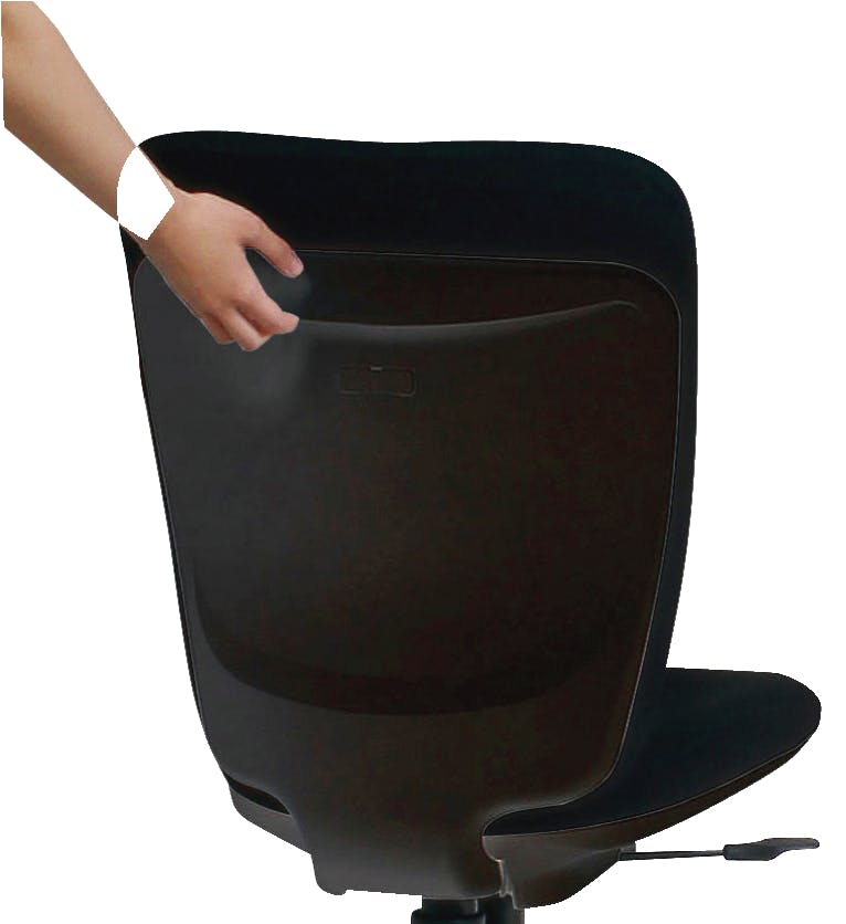 コンパクトな設計で幅100cmサイズの片袖デスクにすっきり収納できるオフィスチェア。手掛けを使うことで直接張地に触れる機会を抑え、クロスを汚さないつくりになっています。