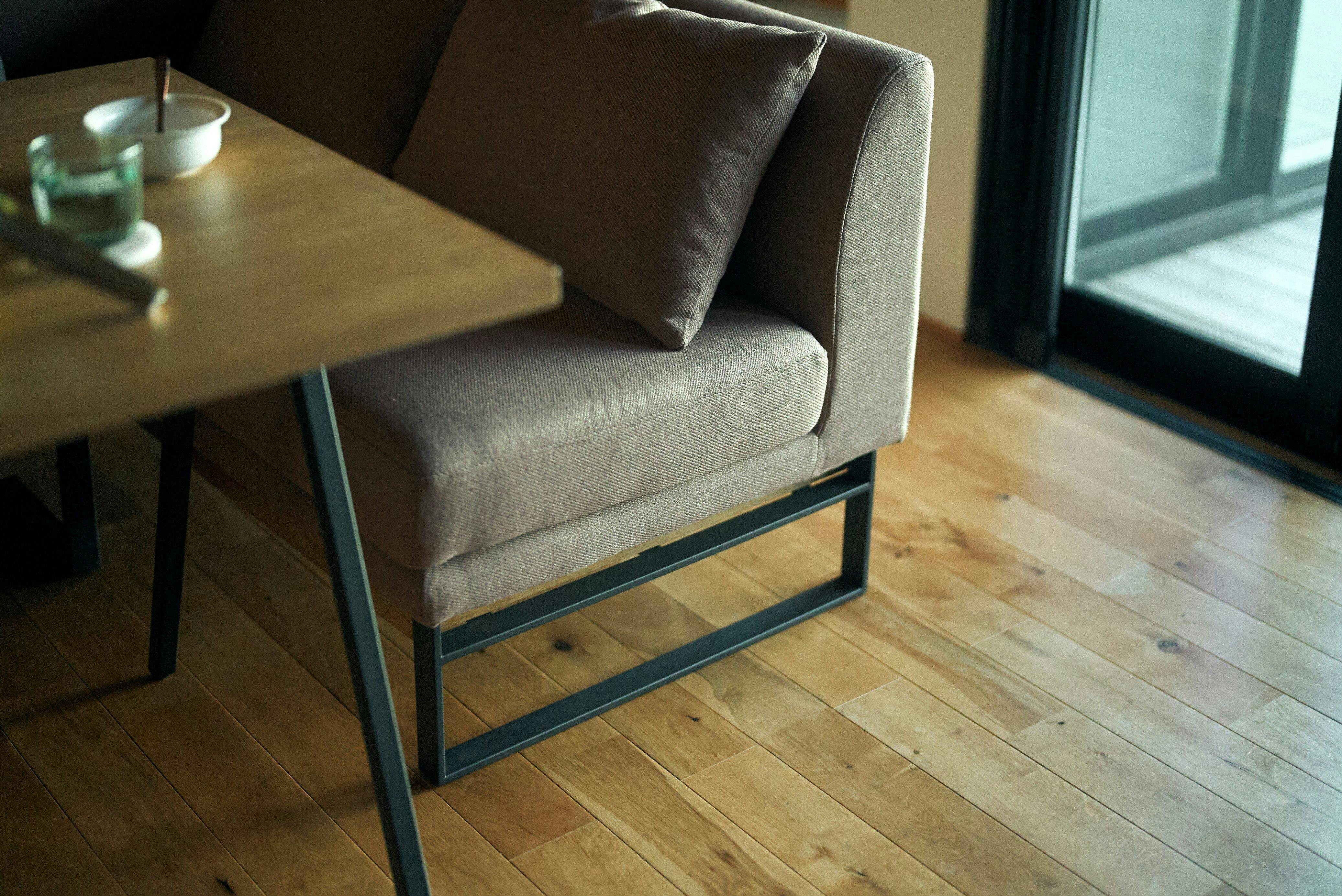 様々な生活スタイルに合わせやすいリビングダイニングソファです。スチール脚を取り外すことでローソファとしてもお使いいただけます。無垢材のフレームとスチール脚ですっきりとした印象です。