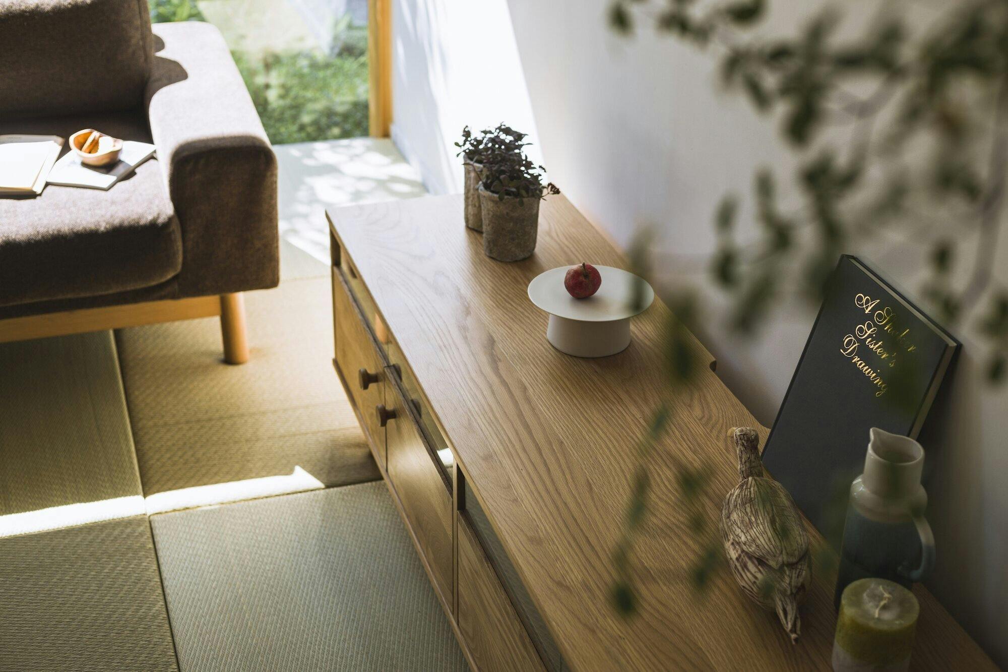 開き戸の上部にガラスの窓があるローボードです。クリアガラスの窓のため、AV機器のリモコンが使用できます。扉を開けると大容量の収納となっており、たくさんのメディアや小物を収納できます。天板や棚にはコード用の隙間が設けられています。