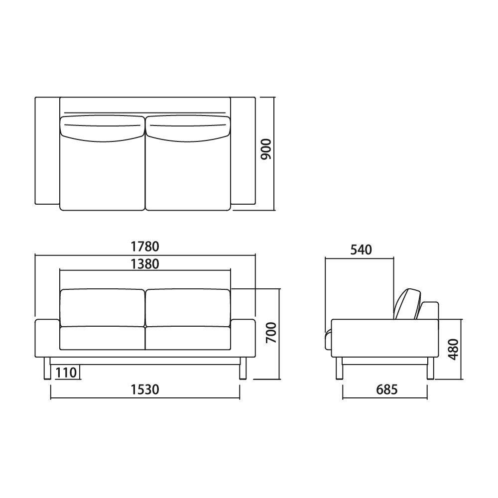 背や肘にボリュームを持たせ、安定感のある佇まいを目指したソファです。背が低く、座面は丸くゆったりとしているのでかわいらしい印象です。2seaterは全体の幅も広く、肘を低く設定しているのでごろんと横になるのにも適しています。背クッションは肘側にも設置が可能です。