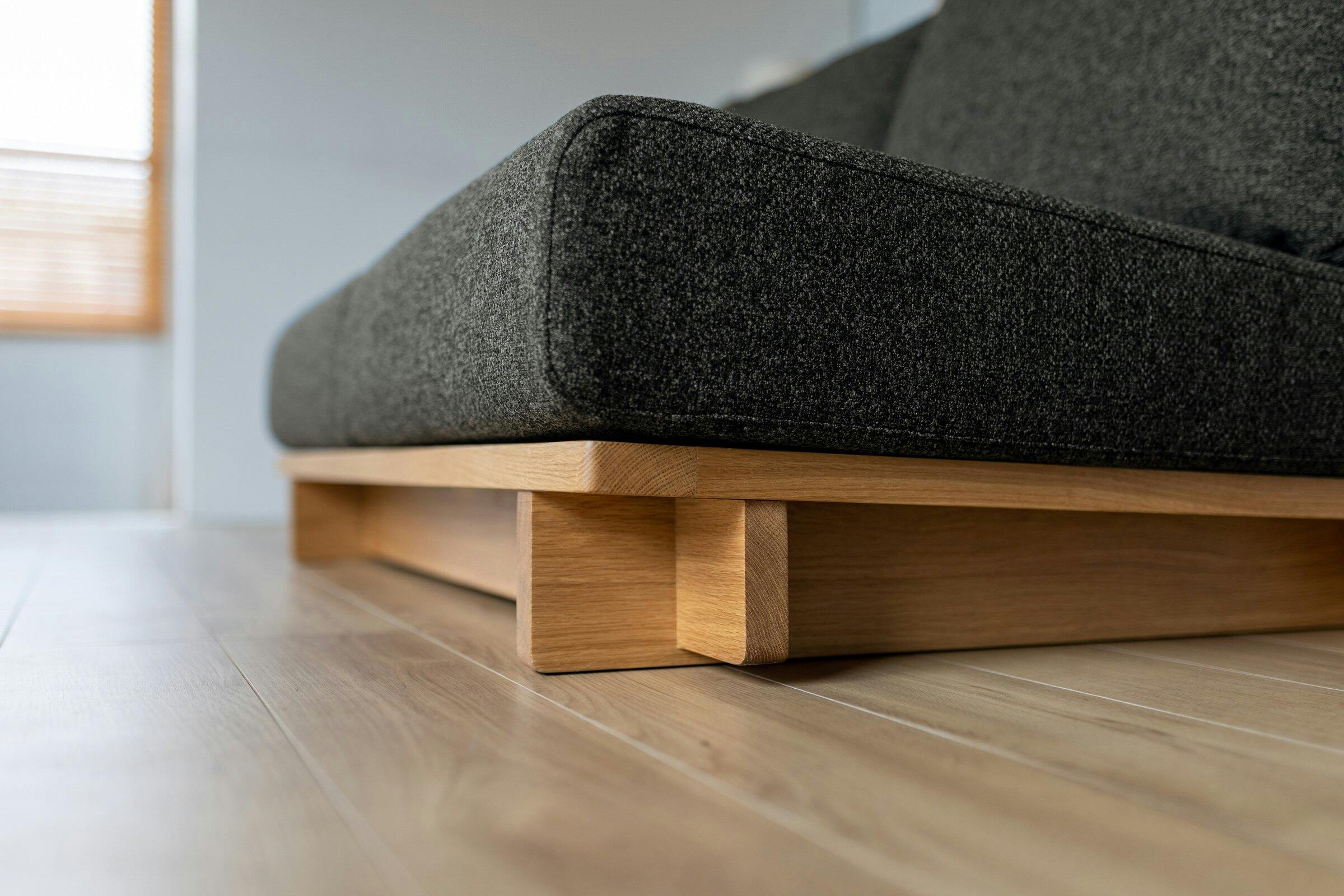 交差した天然木のフレームにボリュームのあるクッションを配置したソファです。座の高さは低めに抑えておりますのでどっしりと体を預けられます。和にも洋にも合う雰囲気を持ったソファです。