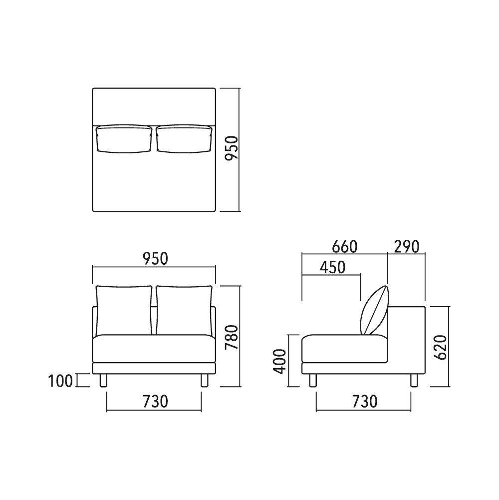 4つのアイテムすべての座クッションのサイズを合わせたことで様々な組み合わせが可能となりました。背、肘となる部分と座にボリュームを持たせつつ高さを抑えておりますので安定感のある佇まいです。背、肘となる部分には腰掛けることもでき、配置場所を選ばない、自由度の高いユニットソファです。