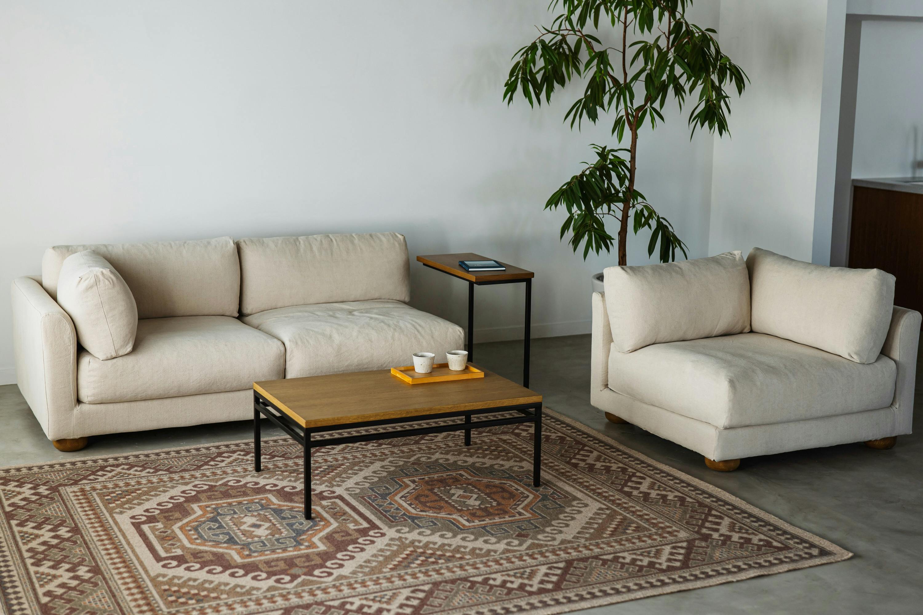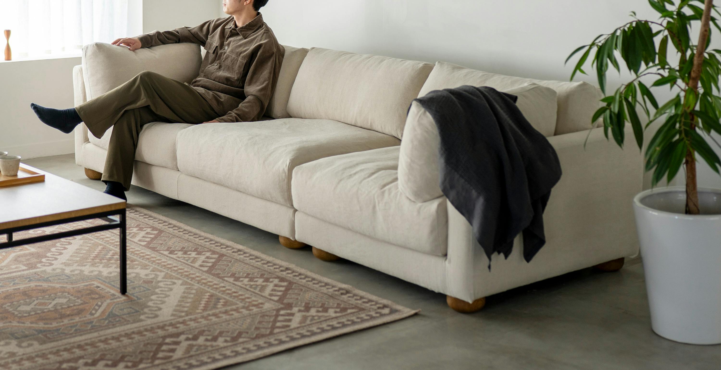 ・ふわっと膨らんだボリュームのある形状が魅力のユニットソファです。クッションにはフェザーをふんだんに使用しつつ、芯材には硬めのウレタンフォームを使用しているため、柔らかすぎない体をやさしく包み込むような座り心地を実現しています。クッションを除くと座面は170×85cmと広めに設計されているため、胡坐をかいたり寝転がったりする充分なサイズになっています。張地は綿とリネンを使用した天然素材の混合生地でリラックス感のあるソファになっています。