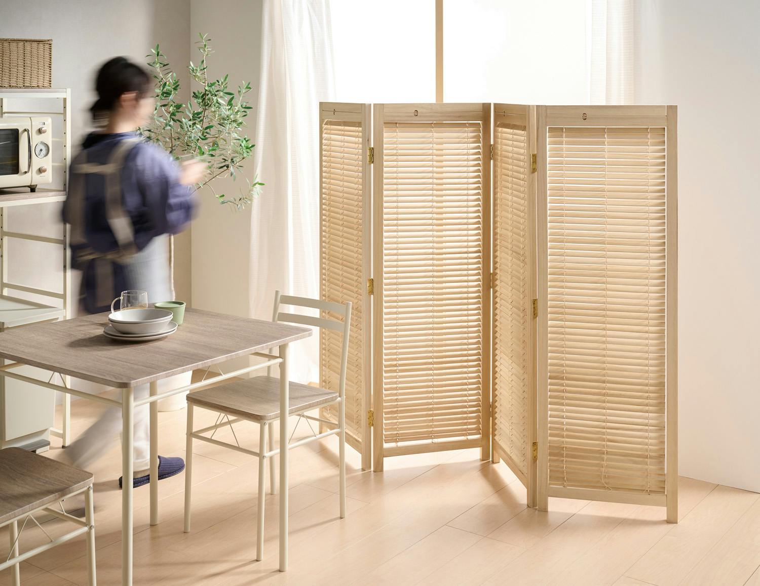 ・ブラインドを開閉する事で彩光と通気が調節できるパーテーション。フレームの上部に付いているダイヤルを回すことでブラインド部分が開閉する仕組みになっています。和室にも洋室にも合うシンプルなデザインでご家庭以外にも旅館や和食の飲食店でも使いやすいデザインになっています。高さを抑えた4連タイプは椅子に座った時にちょうど視線が隠れる高さになっています。
