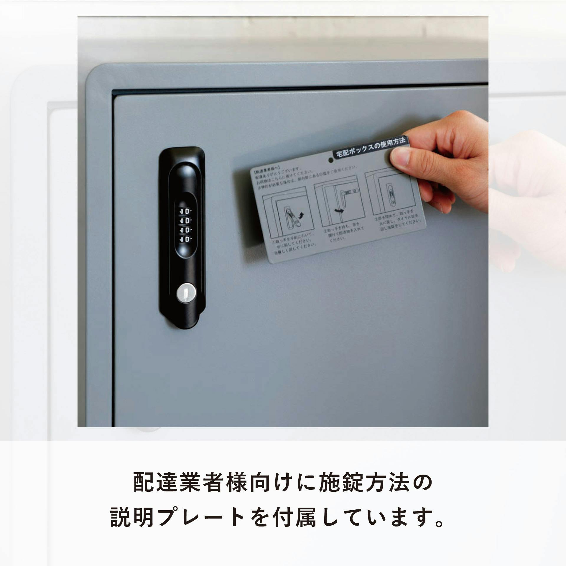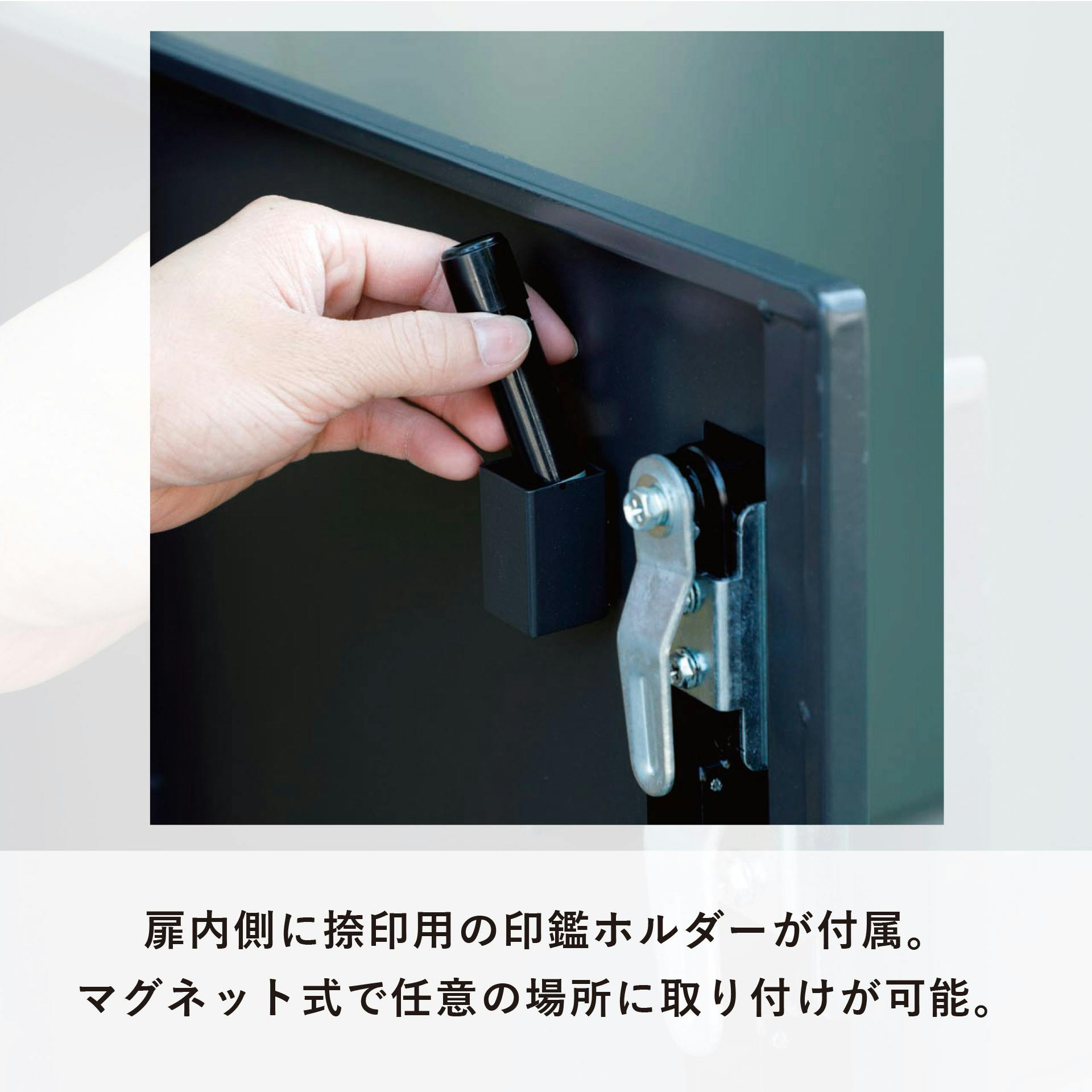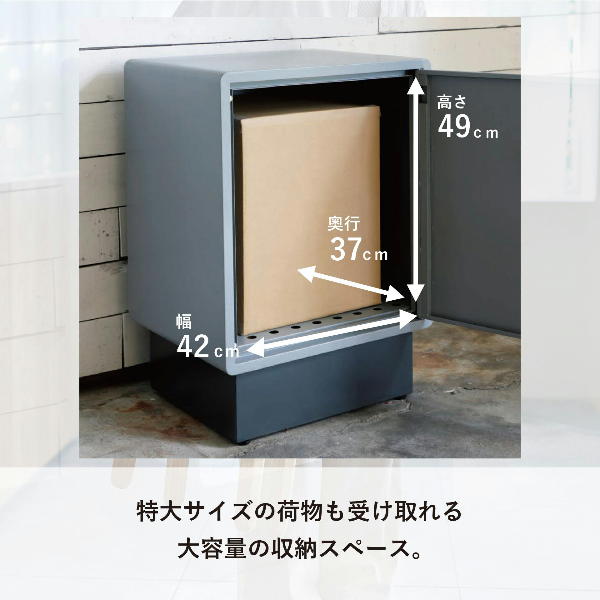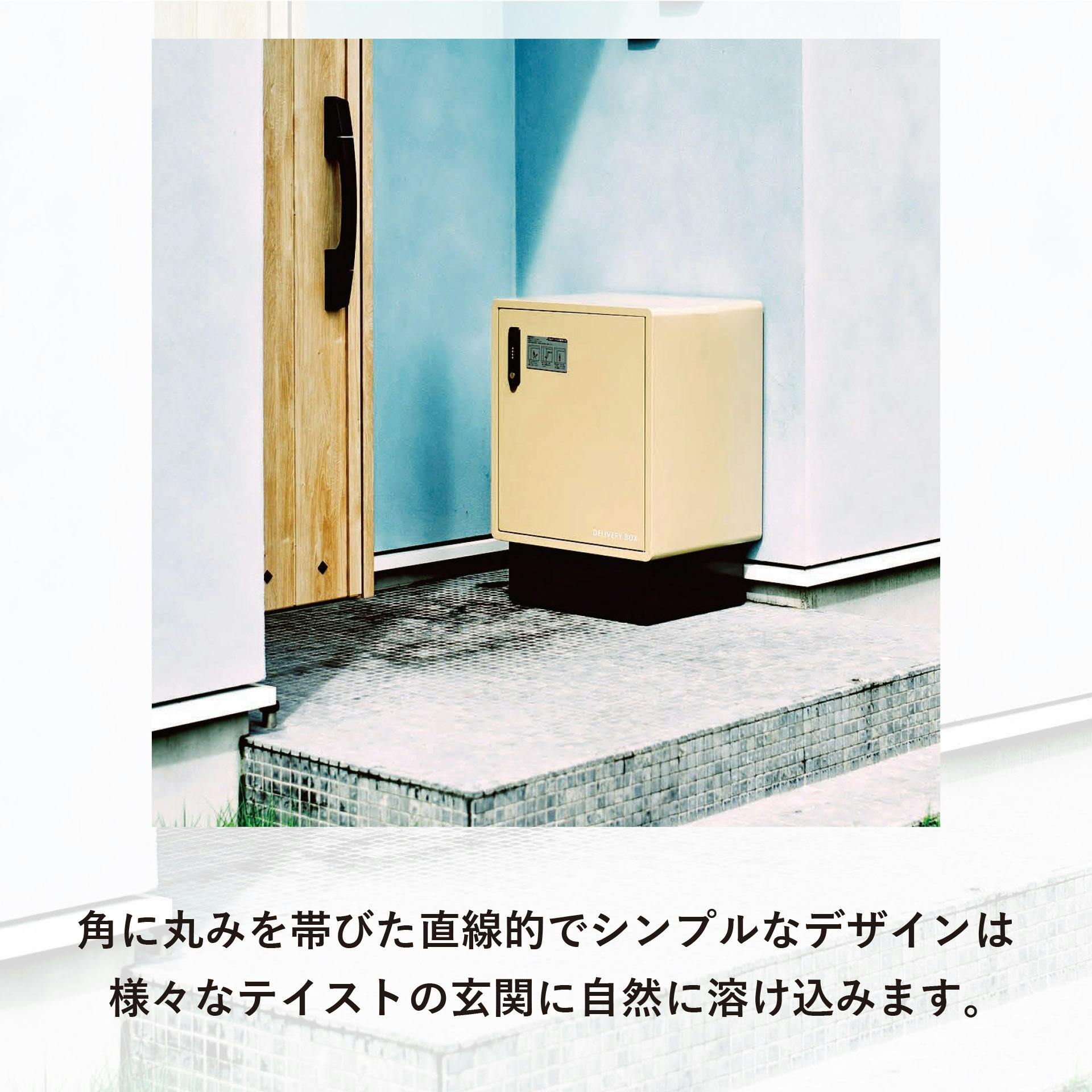 ・角に丸みを帯びたデザインで、様々な玄関先にも溶け込む宅配ボックスです。収納スペースは幅42×奥行37×高さ49cmの広さを確保しており、強風などで動いてしまうのを防ぐため、重りを入れるスペースを底板の下に設けています。鍵を持たずに開閉可能なダイヤル錠を採用しているので帰宅のついでに配達物を取り出すことが出来ます。扉の内側に印鑑ホルダーがあり、施錠方法の説明プレートも付属しているので不在時も安心です。