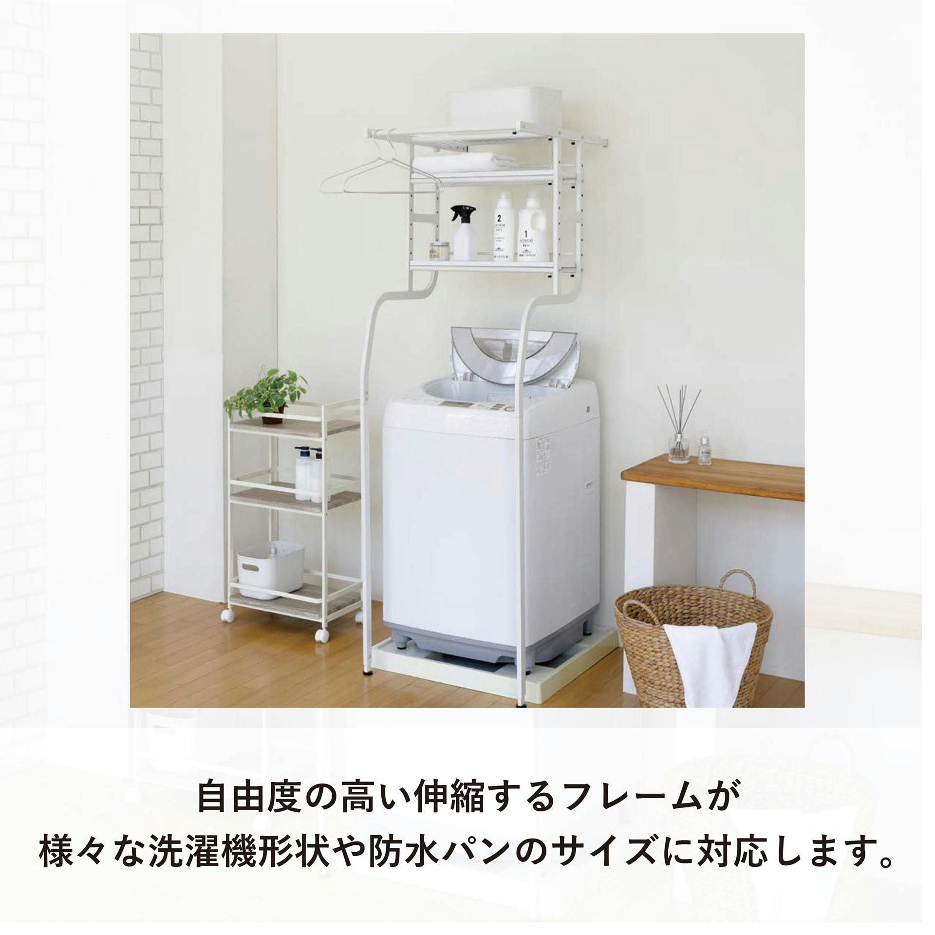 ・立て掛け式で簡単に設置ができる洗濯機ラック。フレームは幅、奥行、高さ方向に調整が可能なので防水パンの前にも横に設置することができ、一人暮らし向けのアパートでも活躍します。棚の上は収納物に合わせて高さ調整が可能で日用品をひとまとめに置くことが出来る収納力、ハンガーや洗濯物を仮置きできるバーなど利便性も高い商品になります。