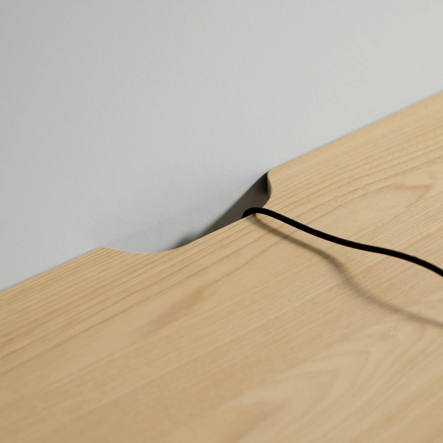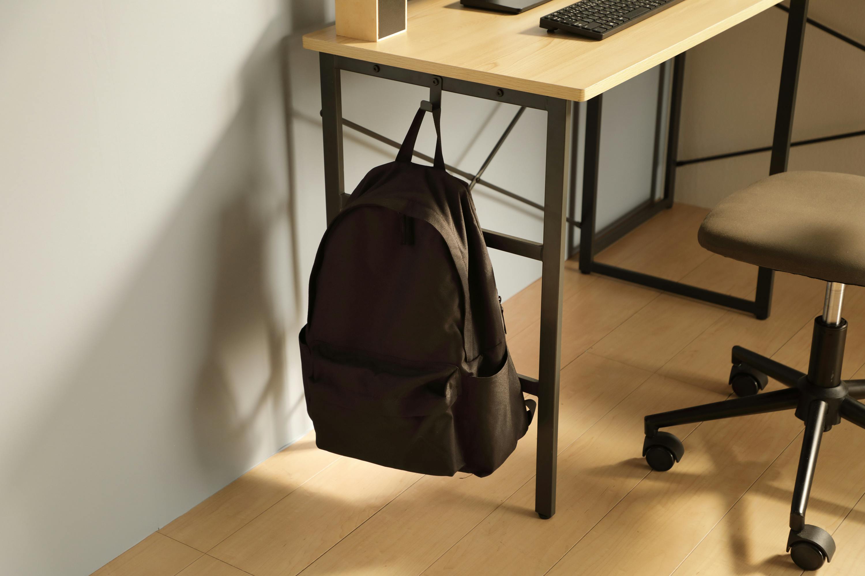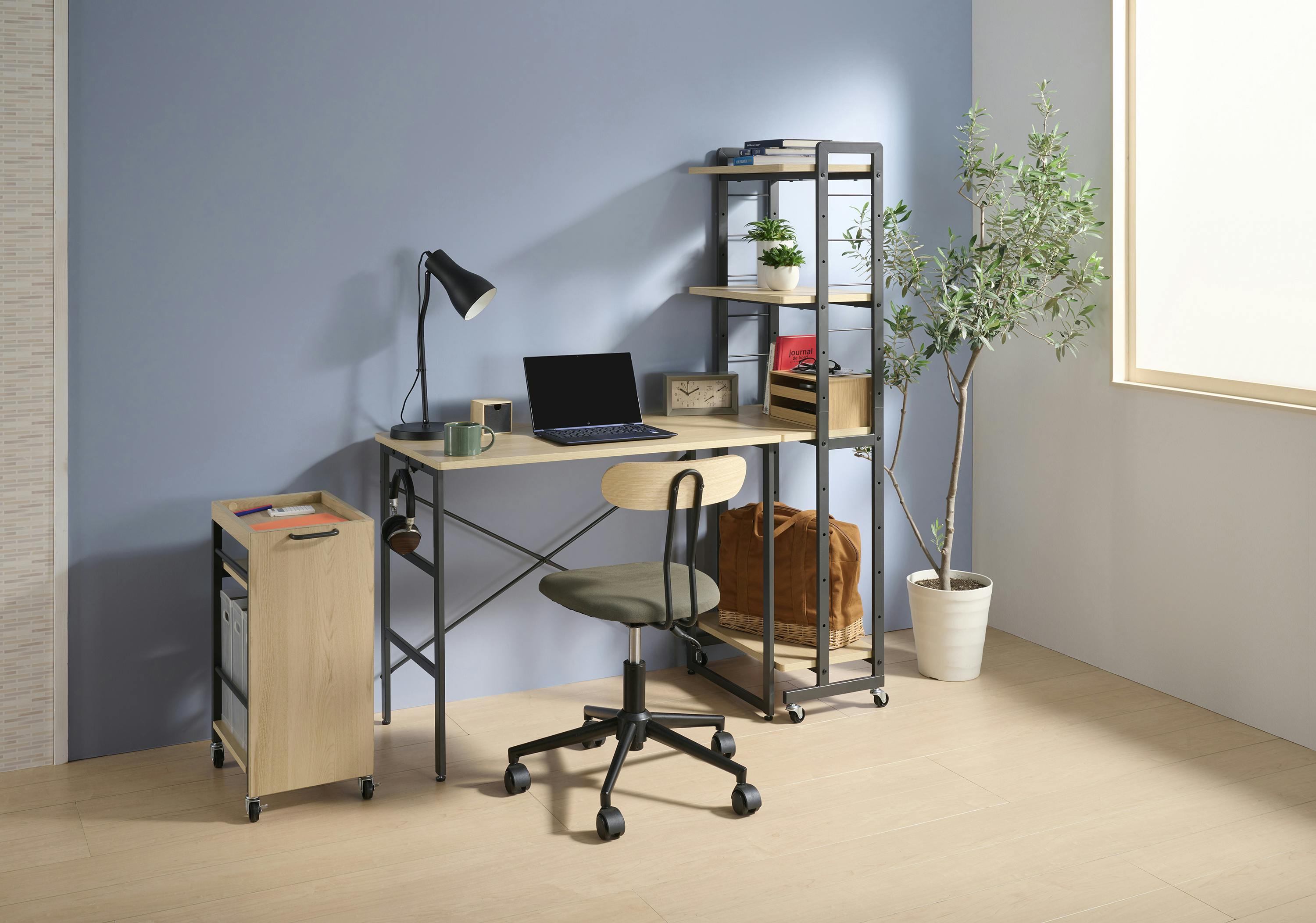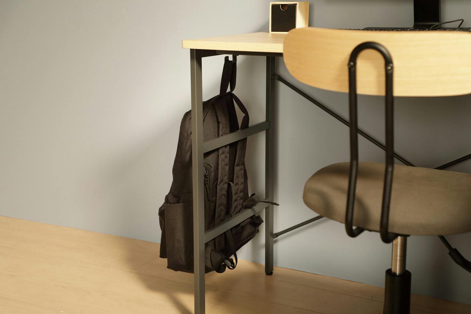 ・ナチュラルカラーの木目調天板を使用したシンプルなデスク。左右非対称のフレームは左右どちらにも組み付けが可能。フックのついたフレームはかけたカバンがゆれない様にフレーム数を増やしています。大きな開口部の有るフレームはラック連結時にモノが取り出しやすい仕様です。天板には傷や熱、汚れに強いメラミン化粧板を採用しているのでお手入れが簡単です。