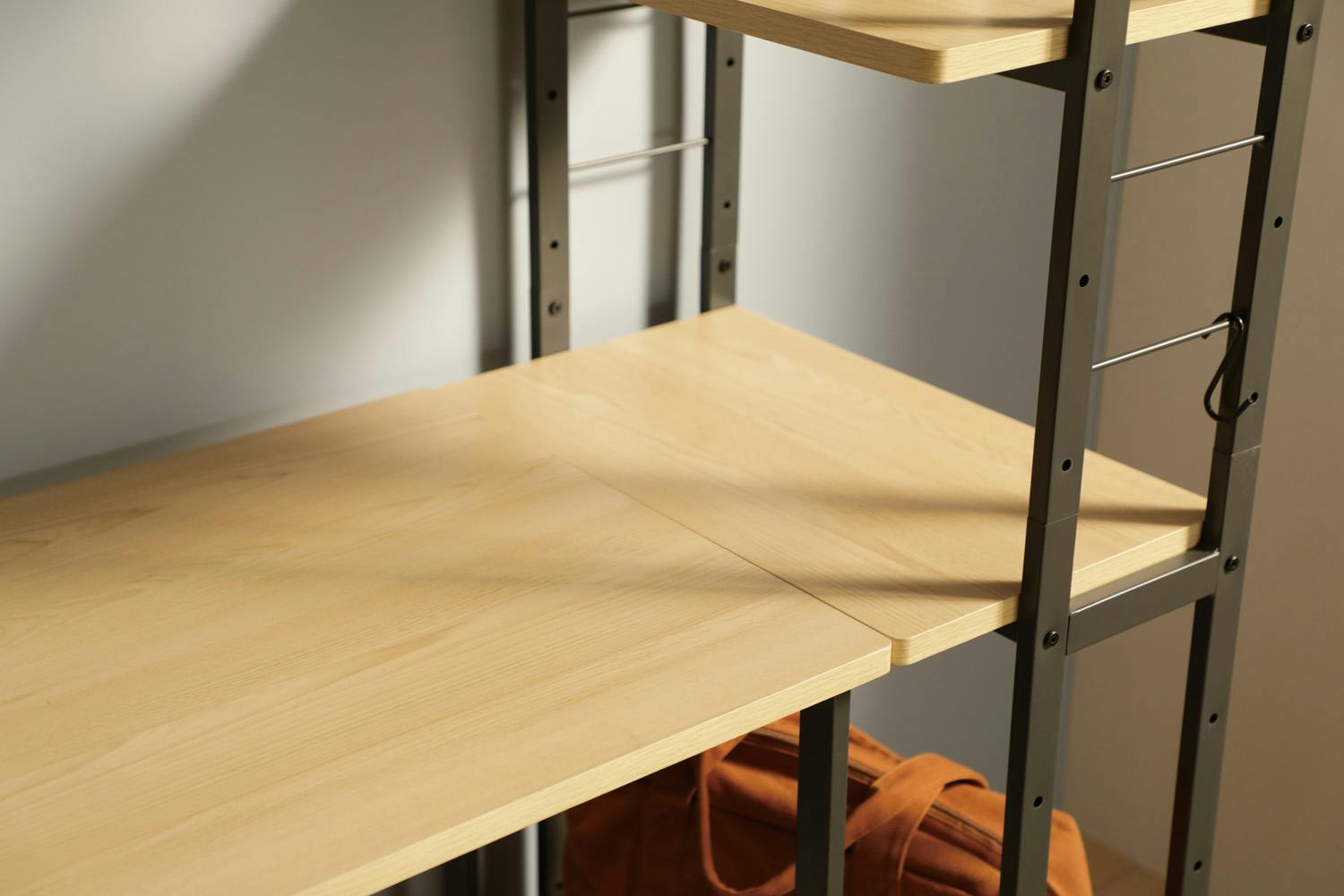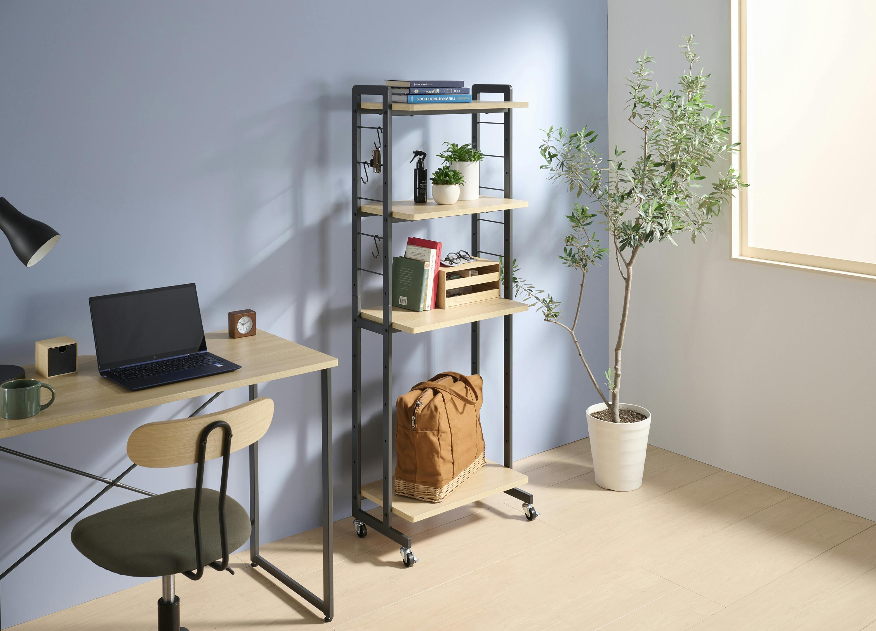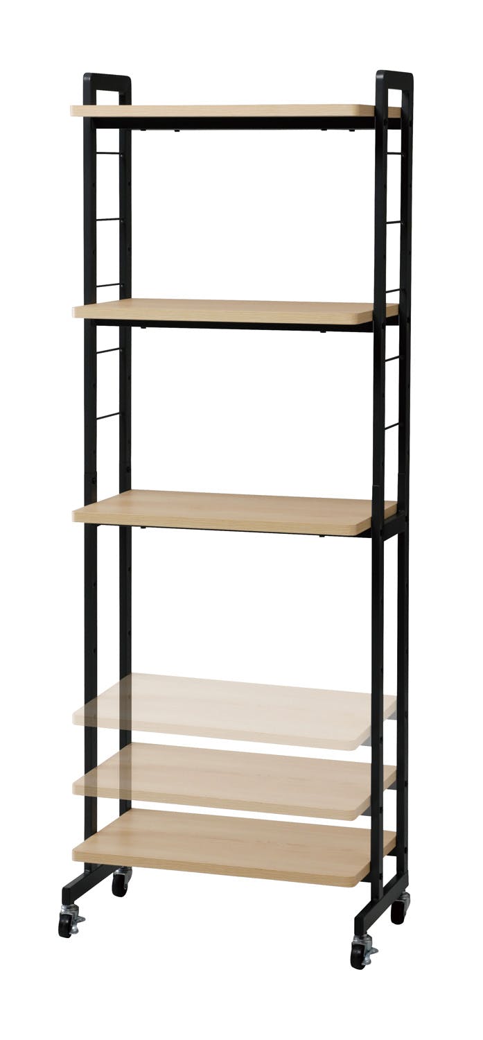 ・ナチュラルカラーの木目調棚板を使用したシンプルなラック。サイドフレームのデザインにより、圧迫感のないスッキリしたスタイルを実現したキャスター付ラックです。S字フックが3個付属しているので、小物をサイドフレームに引掛けることが出来ます。