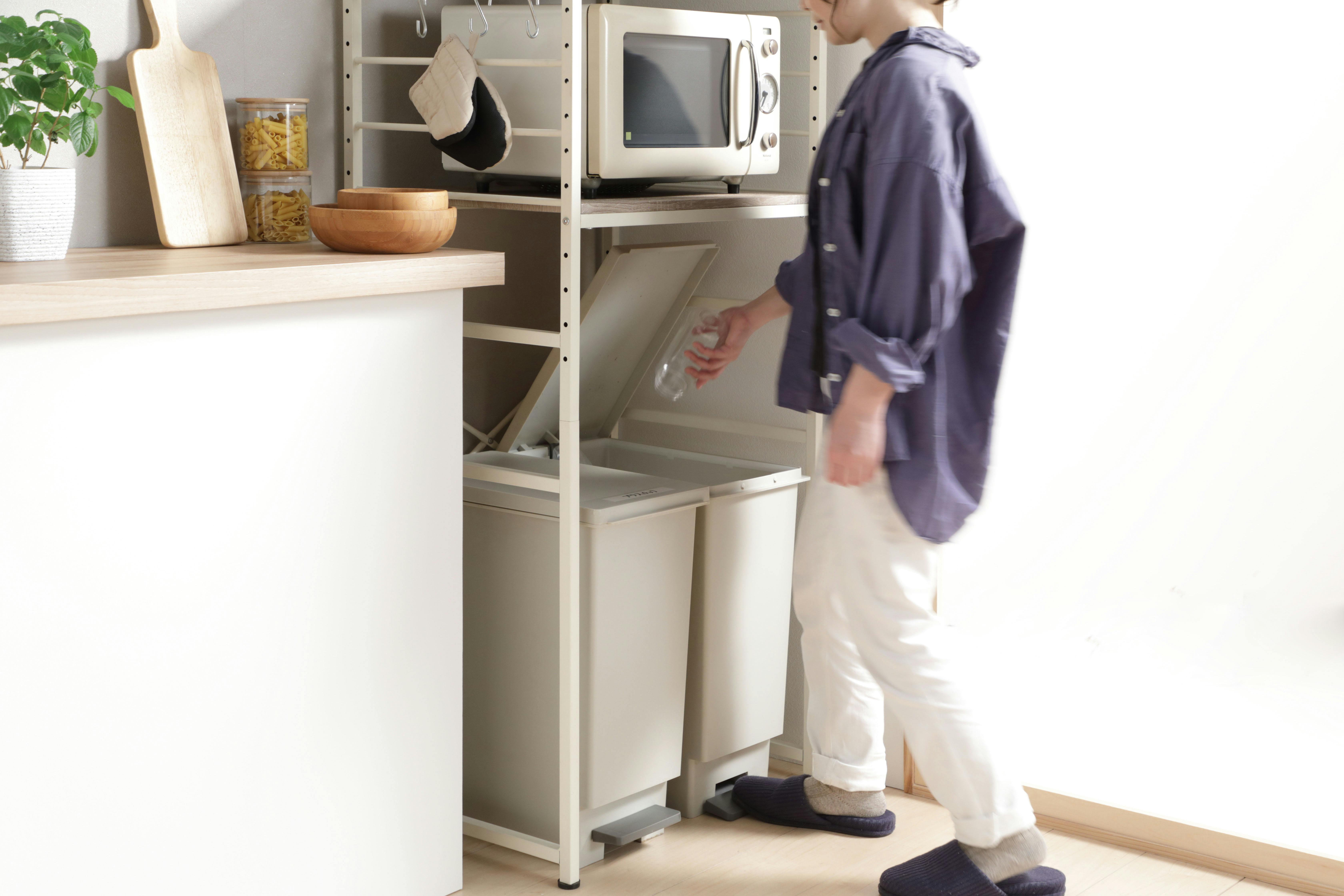 ・ごみ箱を跨いで上部のデッドスペースを活かす収納ラック。棚板は大型レンジも設置可能な広さを確保。棚の高さは50mmピッチで調整可能なのでごみ箱の開き方に合わせて棚板を設することも出来ます。
